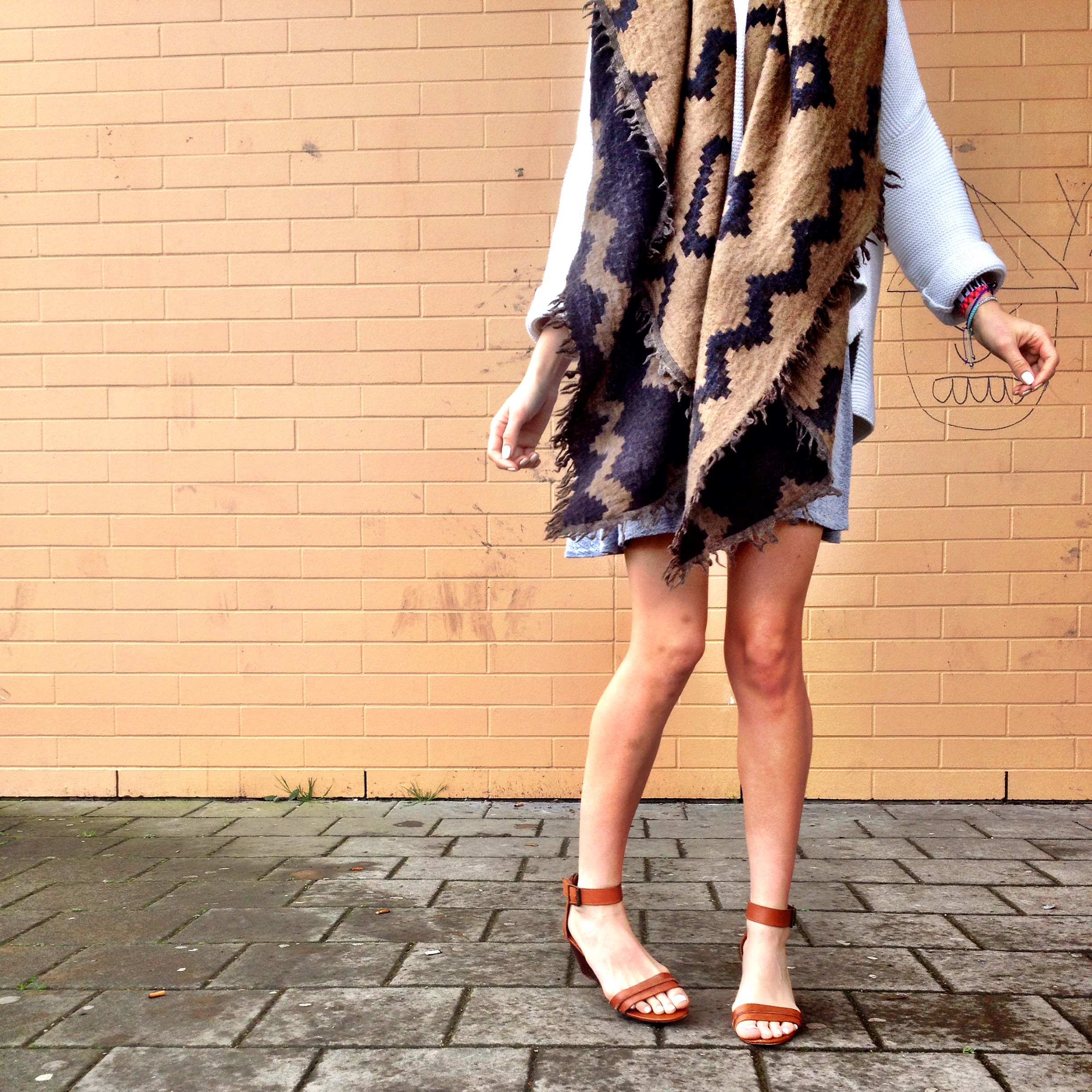 Certainly a necessity for this time of year with the weather fluctuations within one day. Always appreciate a skirt and heels and these wedges are nice. Love the shawl and the sweater as well. π