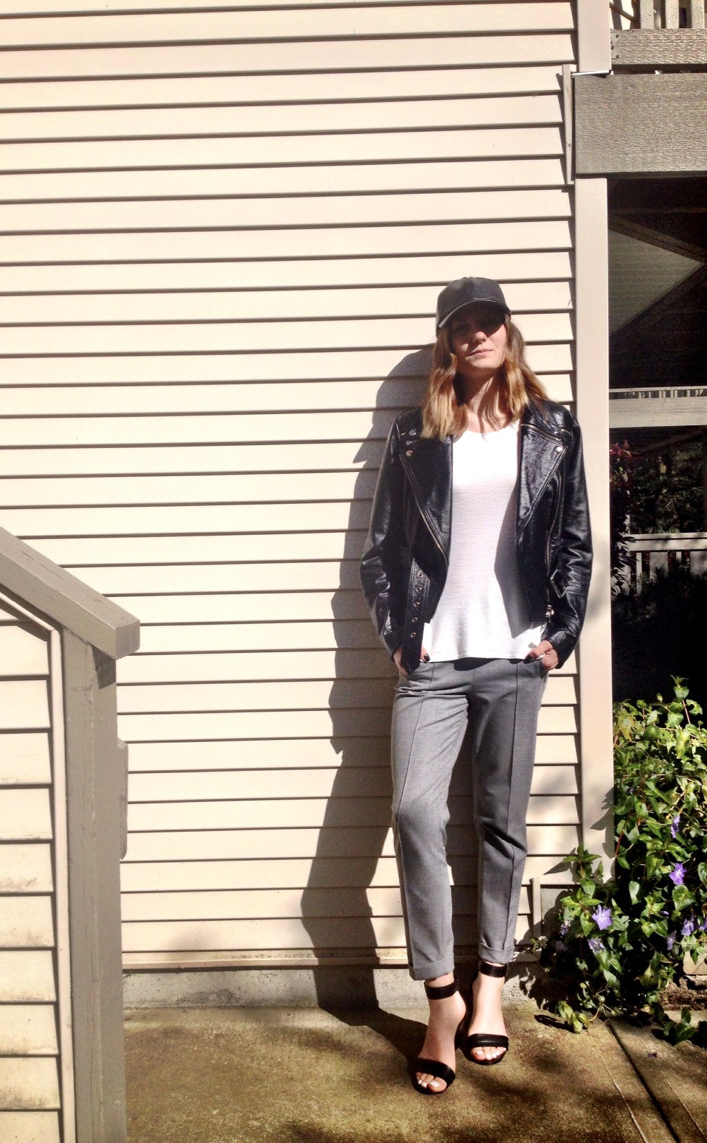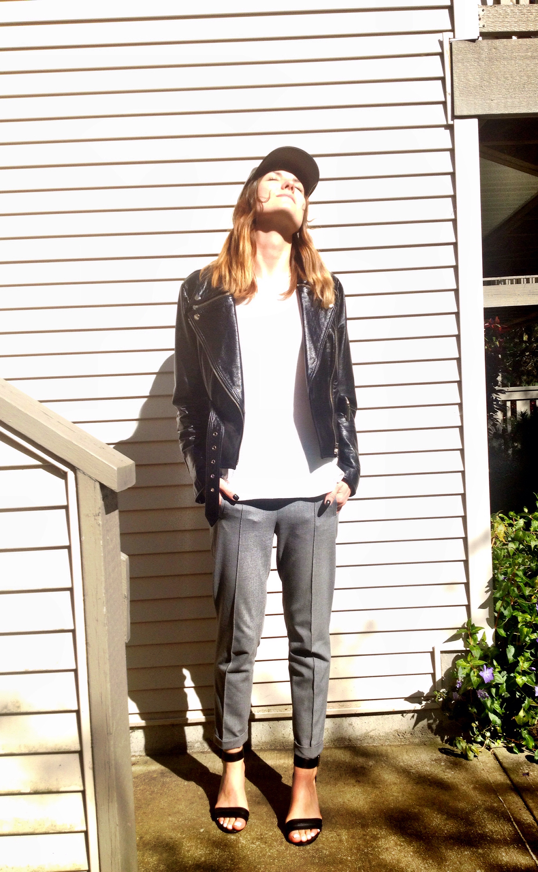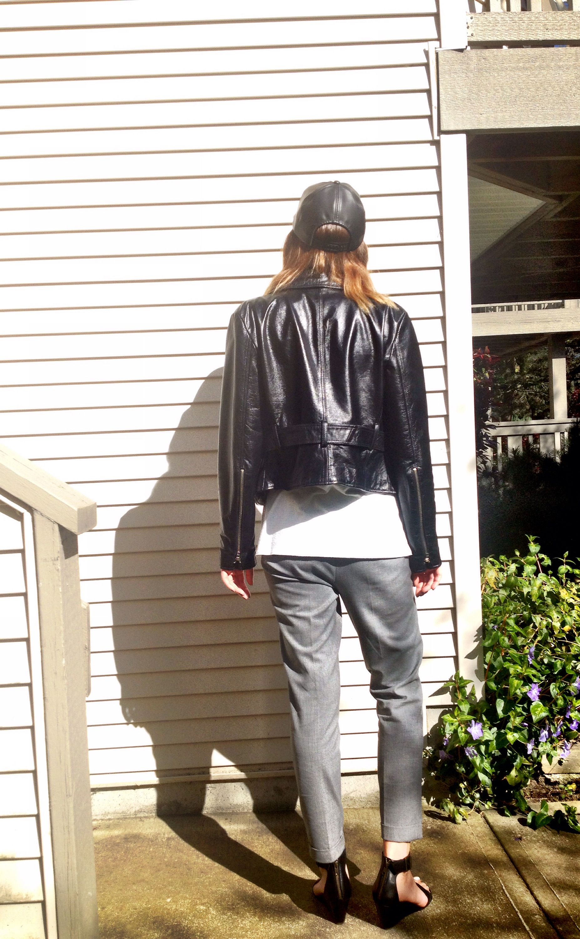 Last post I shared with you a basic, professional look which would be perfect for the office or a job interview. Here is a much more causal take on the same outfit. Just a minor jacket change and the addition of my leather ball cap make it way more appropriate for stealing some sunshine on a patio than the 9-5!