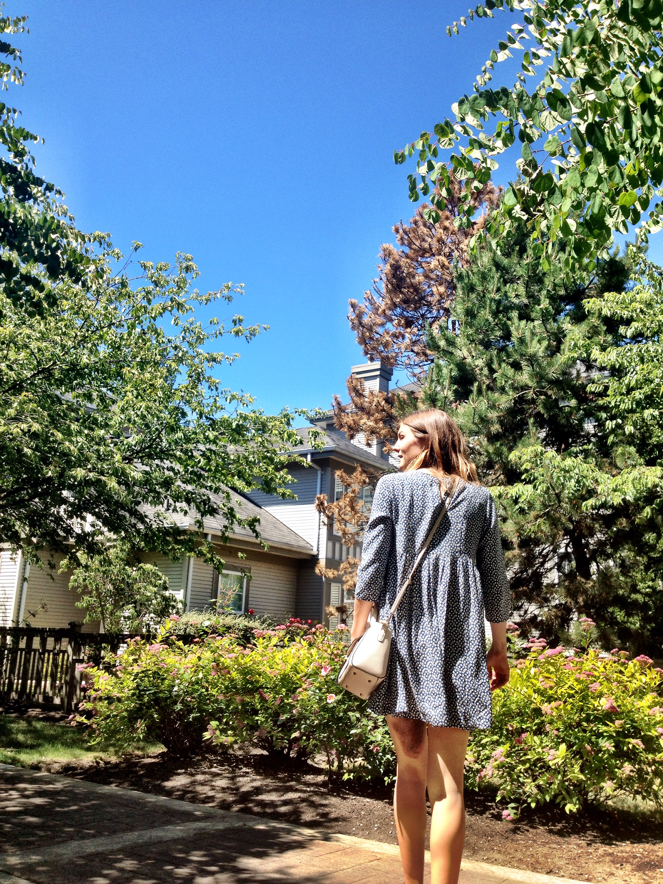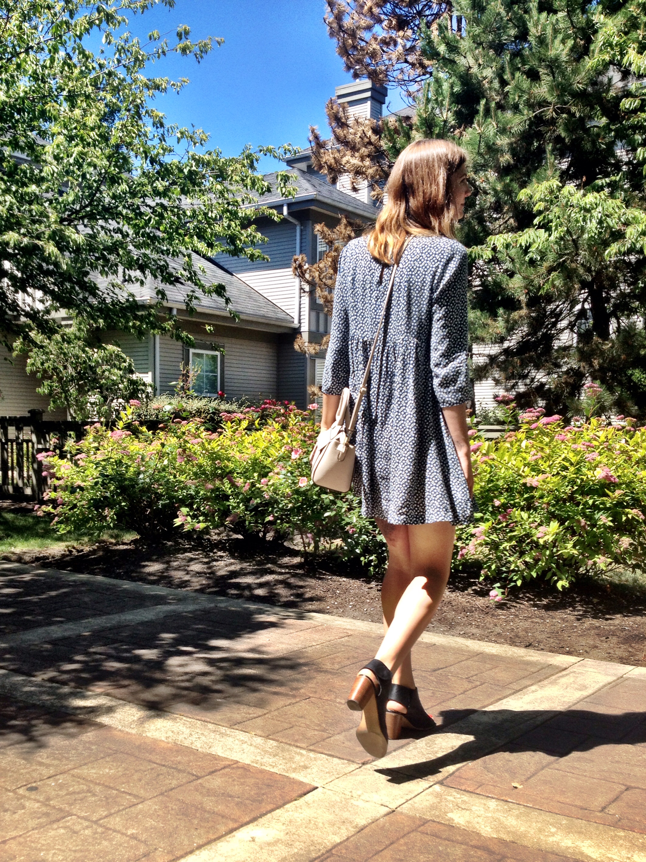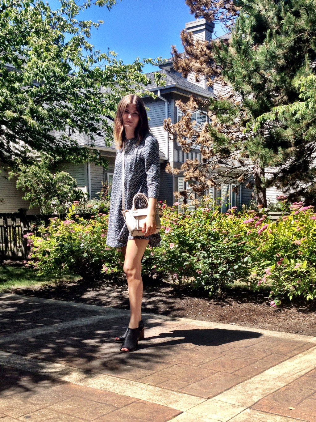 Another hot day in Vancouver and another breezy baby doll dress to twirl away the day in. I have been putting this look together a lot and it’s only the first week of June! I am not usually one to wear navy, but this dress with a 70’s inspired print caught my eye. It’s lightweight so even with sleeves I can still get away with it in the sun. The short length is nicely balanced out buy the fact that the rest of the dress is conservative and not form fitting in the slightest.