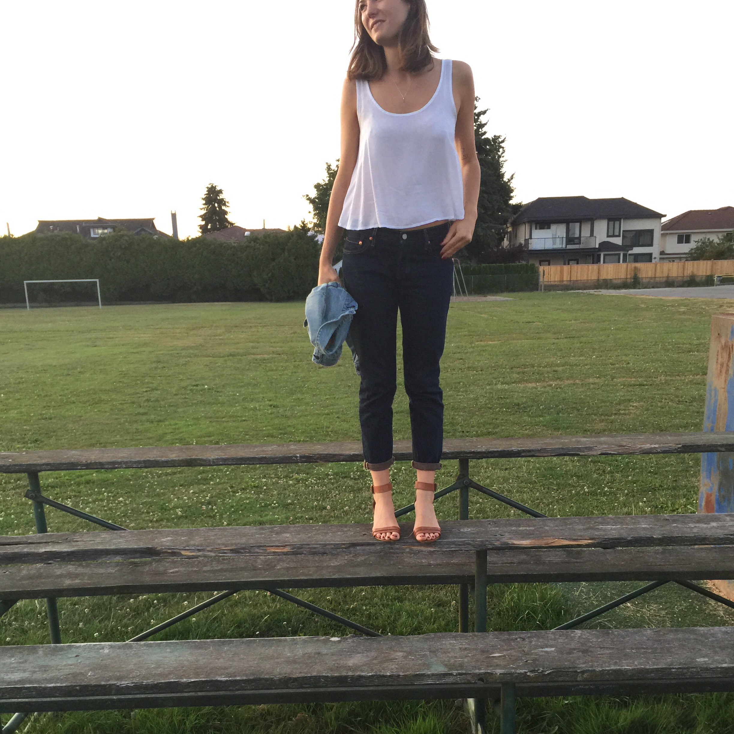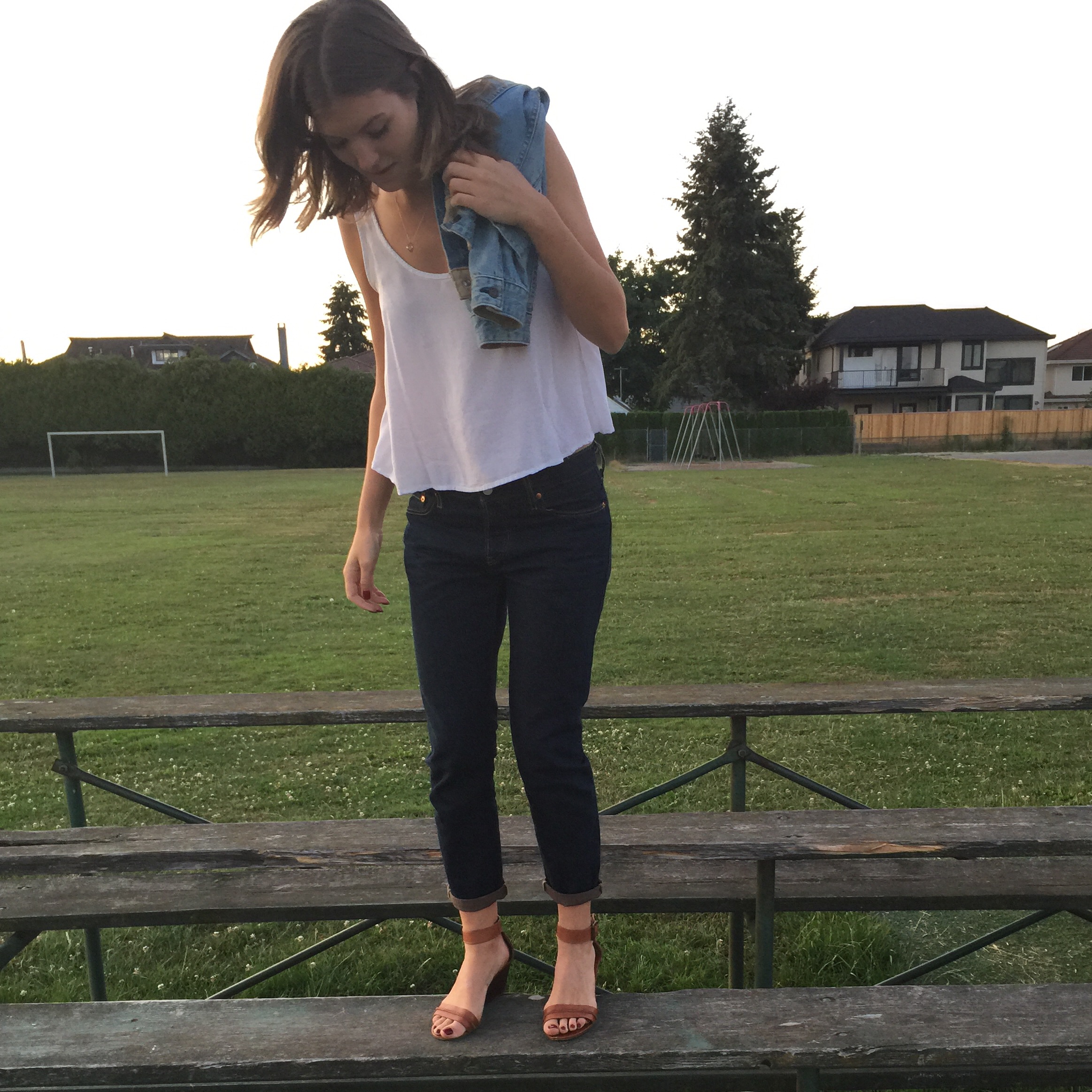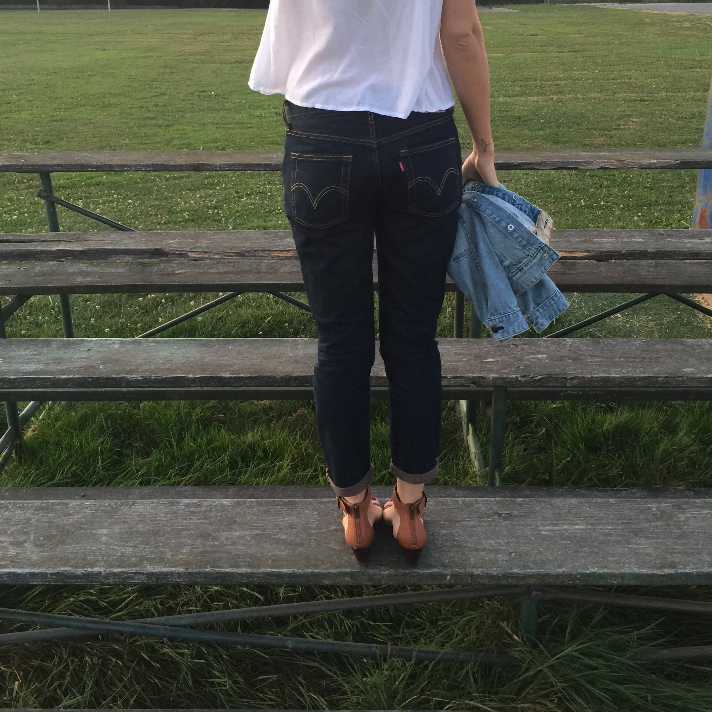 Jeans: Levi (mine were half this price so guess the outlet was worth it!), Top: Forever 21, Shoes: Steve Madden (similar), Denim Jacket: Gap Kids