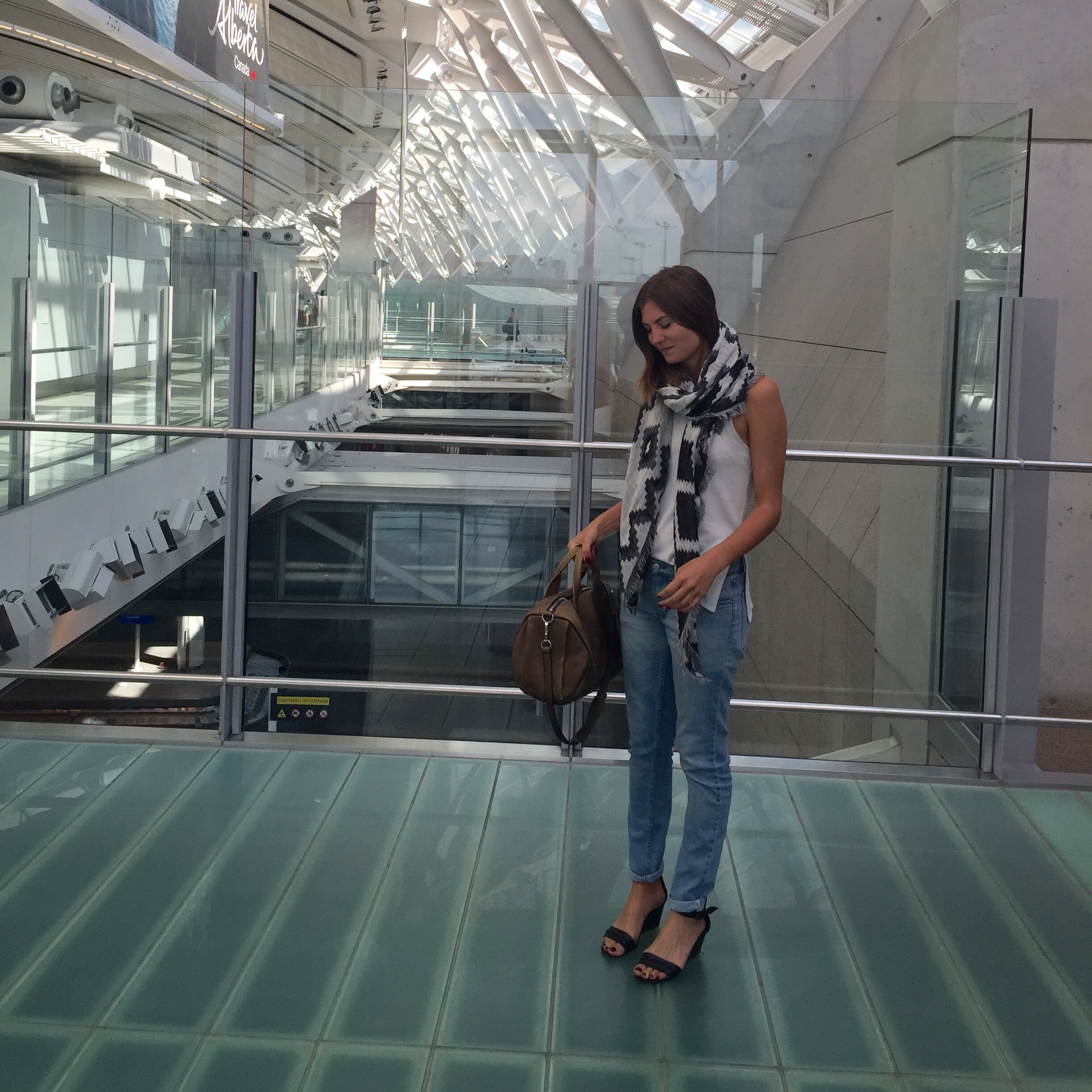 I wore these small heels because they are easy to walk in. My feet swell when I travel so I prefer to choose sandals or low heeled booties that I can normally wear comfortably for a whole day. The first time I ever travelled for work I wore new full height heels and I almost crippled myself doing so. Lesson learned!