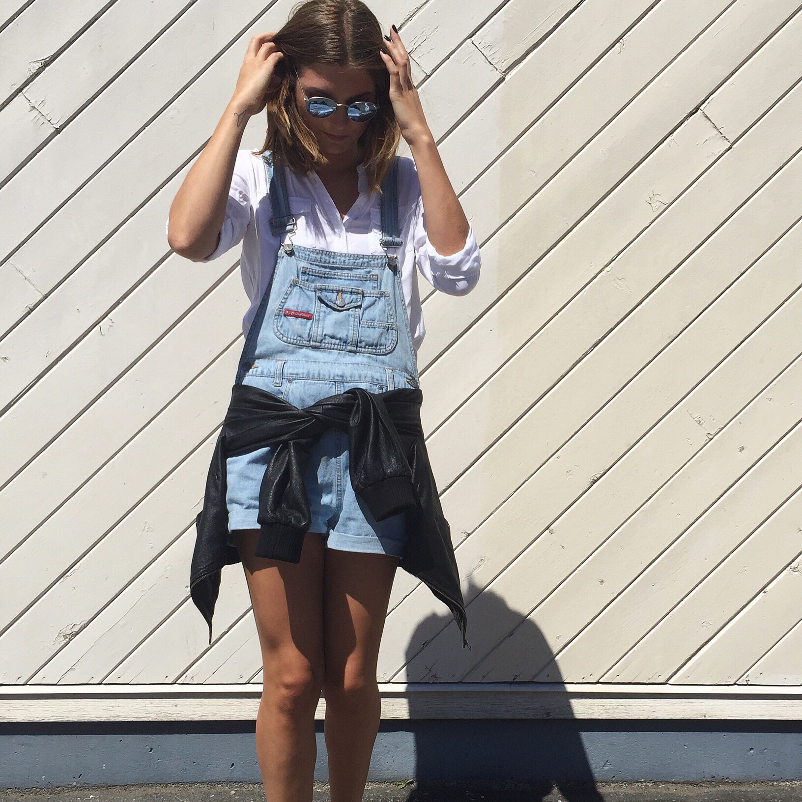 Shirt: Aritzia, Overalls: Vintage, similar from Forever 21, Shoes: Steve Madden (similar), Sunnies: Ray Ban, Leather Jacket: H&M (similar)