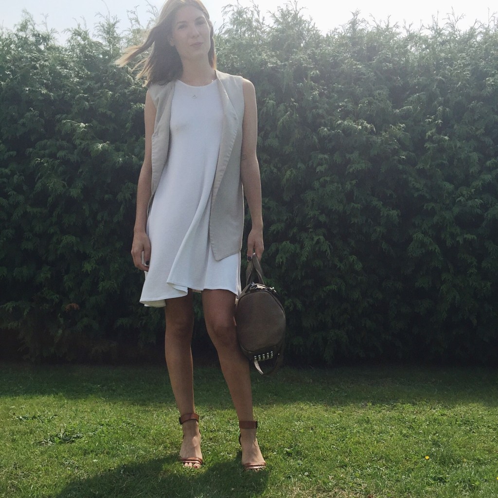 So start with a simple white dress that floats around you like a dream, and add a open sleeveless blazer for something interesting that isn’t too hot and heavy. This one is a linen blend and I got it second hand. I like that it makes one of my favourite dresses from this summer into another, slightly less casual (but just as cool and comfy) outfit! I think this look will be big for fall too with a bit more built up layering…