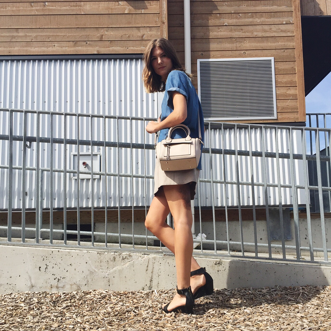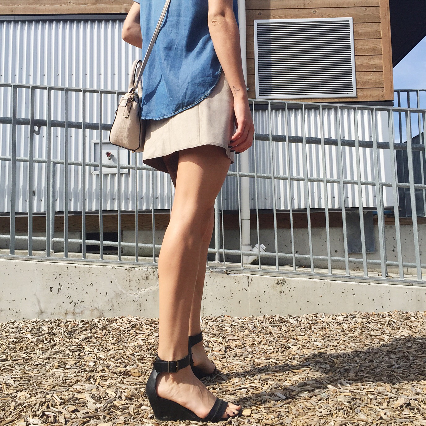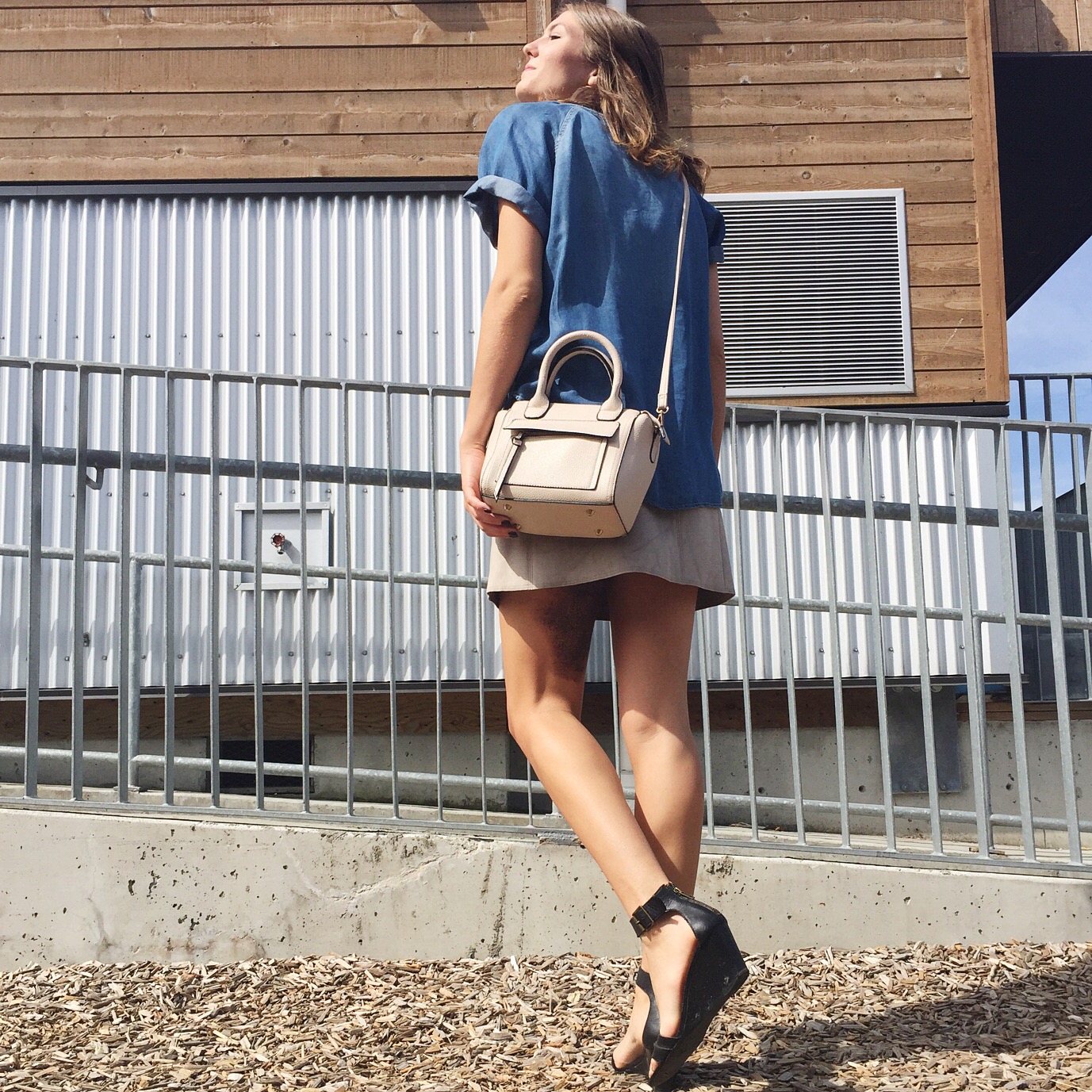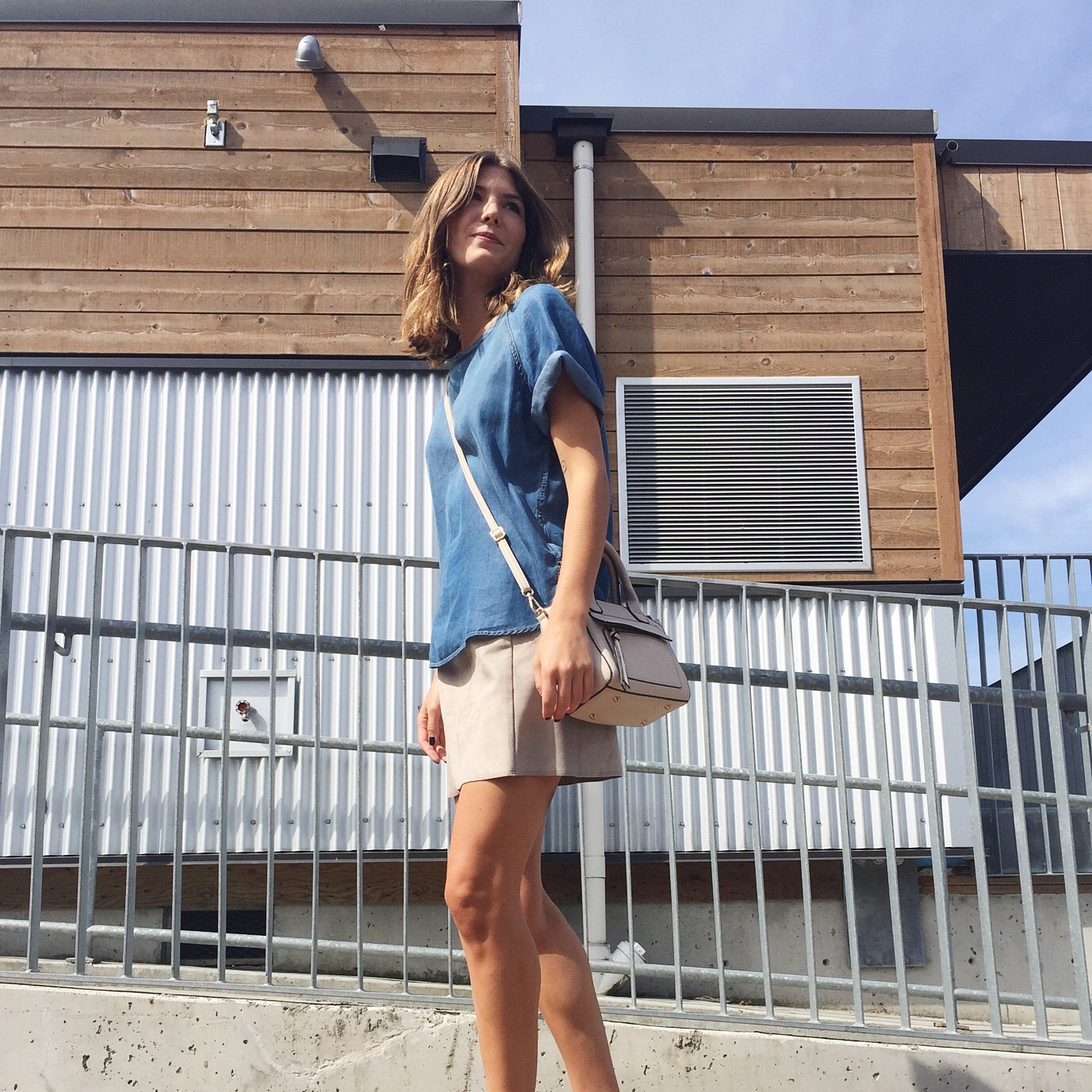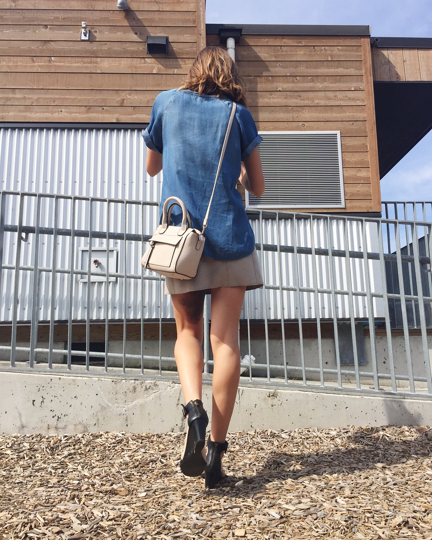 In my previous post I paired this skirt with a crop top, but you can see here it also goes with a longer denim shirt. The high cut sides in the shirt and the mini’s short length mean the look isn’t too shapeless even though nothing is very fitted. At first I wasn’t sure about wearing something longer with this skirt, as I had planned on mostly tucking shirts in or wearing cropped sweaters this fall, but I guess the a-line skirt is more versatile than I thought!