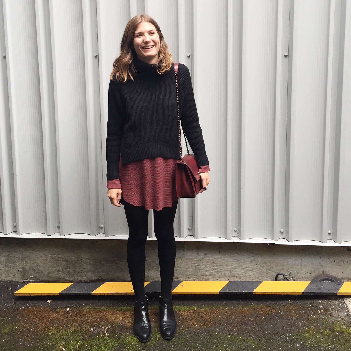 For now at least, just layering a sweater over a dress is warm enough. This one happens to be merino wool and a very finely knit so it’s especially good at keeping the cold out. Gone are the days when half my wardrobe would be packed away until next summer, just throw on a sweater over that dress and go! Turtlenecks work extra well for layering since they make the collar of the dress not matter so much.