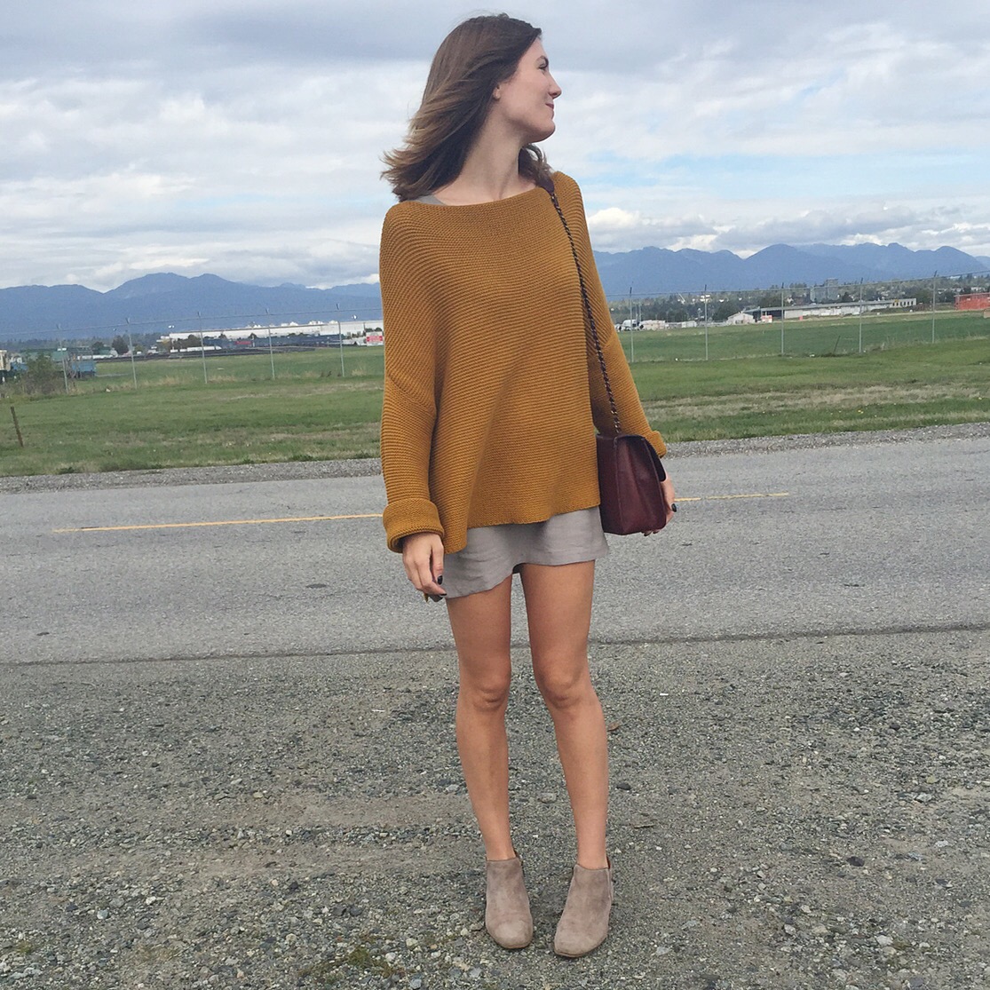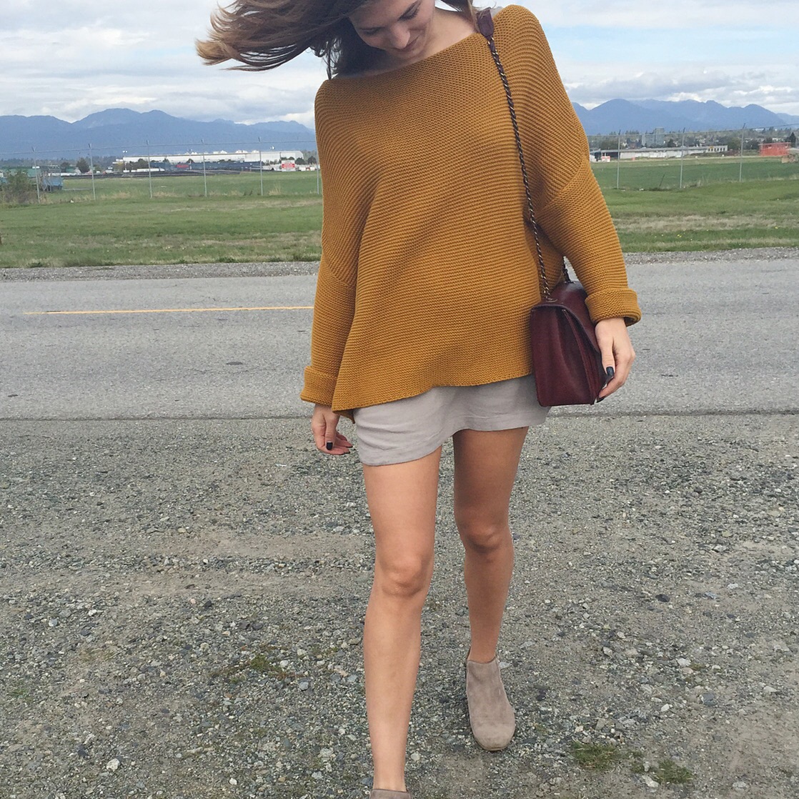 No sunshine for me this afternoon (as you can see in these photos), so sweater weather it is! As you know, I’m loving a good sweater layered over a dress at the moment. Something about it is just so easy and helps keep you warmer since you bundle up around your core. Oversized cozy knits like this one are my favourites – and since this one is made of cotton yarn it doesn’t have all the bulk of a thick knit wool and drapes nicely. I’m a little outside of my usual safe neutral colour pallet with this outfit, but if anything can inspire me to wear colours it’s the gorgeous leaves starting to fall outside.