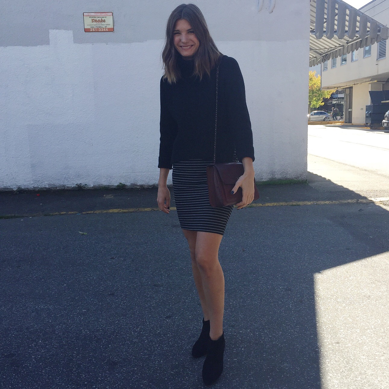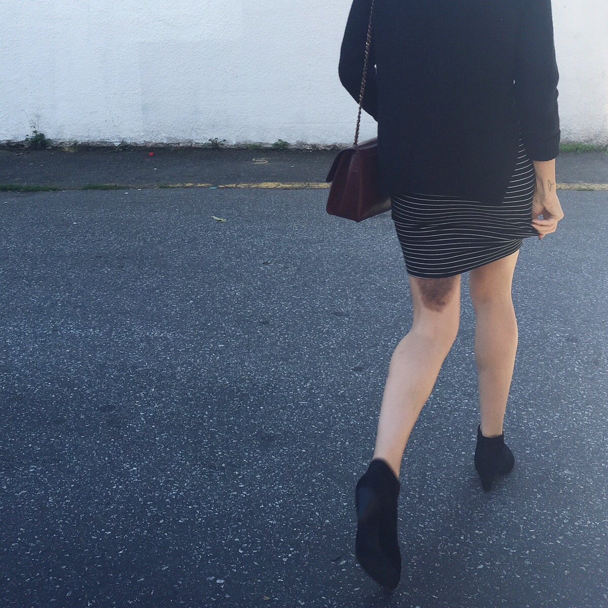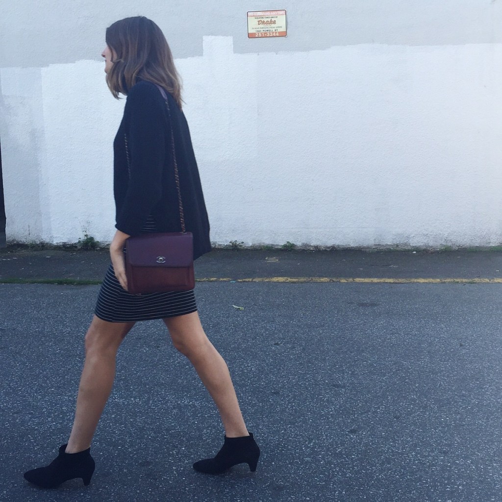 I have to stick to all black and white for my job, but in most settings you can have a bit of fun with colour as well. For me it’s enough to just stick with my usual monochrome and let the bag steal the show! Stripes are more my speed anyways.