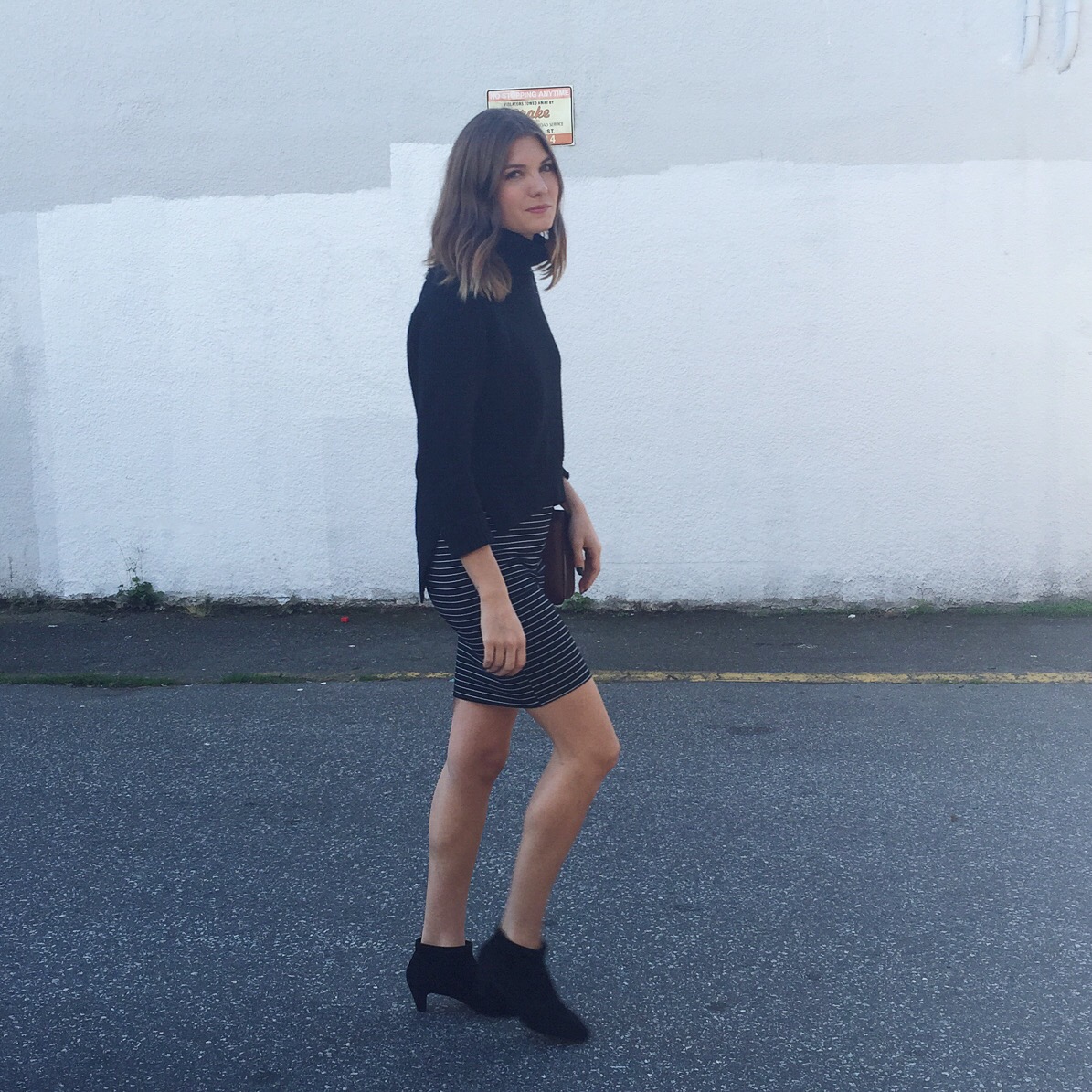 You probably recognize this turtleneck from Aritzia and dress from Zara from earlier posts. What I always look for when sussing out “work” clothes are pieces I can also use in my wardrobe on days off. For instance, this turtleneck I wear regularly with high waist jeans or leggings, or over other NSFW dresses. The dress also looks super cute with a jean or leather jacket and sneakers for a much more casual outfit. If you work in a more formal setting than I do, subbing a midi skirt would certainly be appropriate, or a trendy pair of culottes if you dare! Also, if you’re not a giant, this dress would no doubt be more conservative.