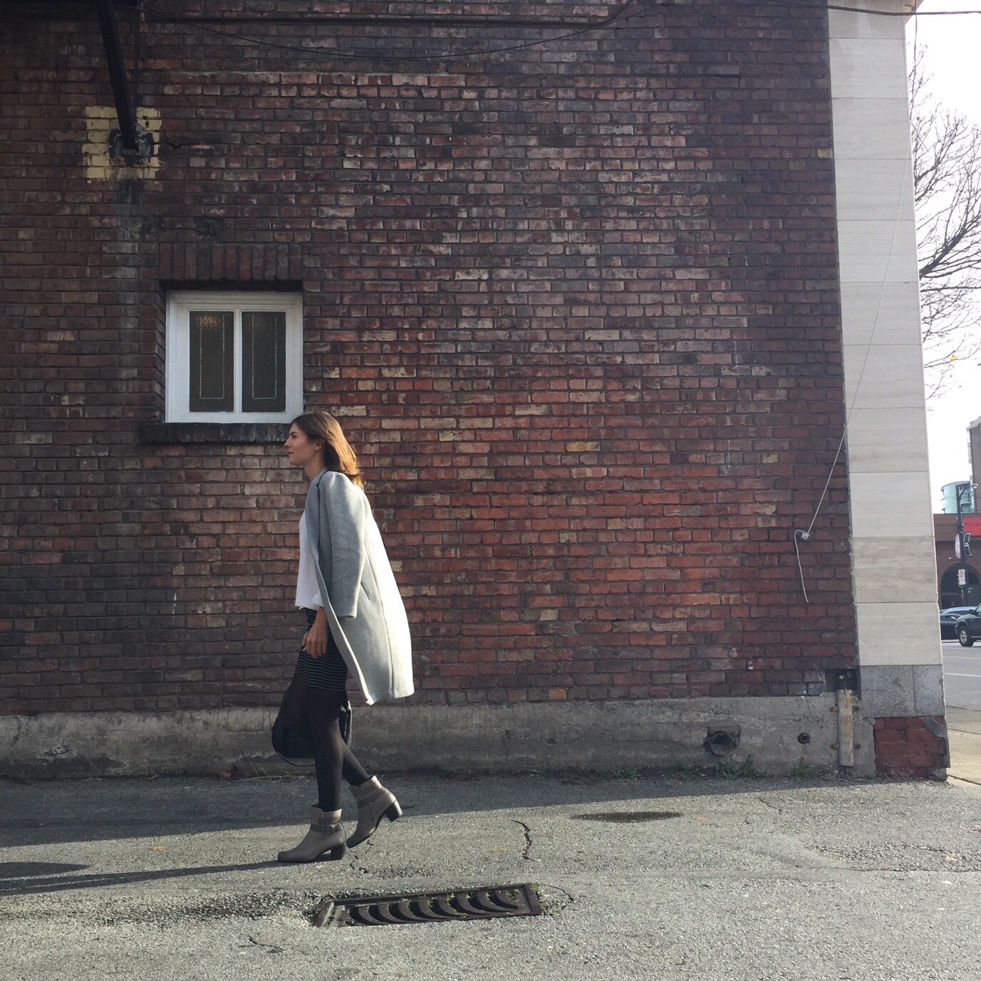 Jacket: Aritizia, Dress: Zara, Sweater: Zara (similar), Tights: Forever 21, Boots: Ecco, Bag: Marc by Marc Jacobs