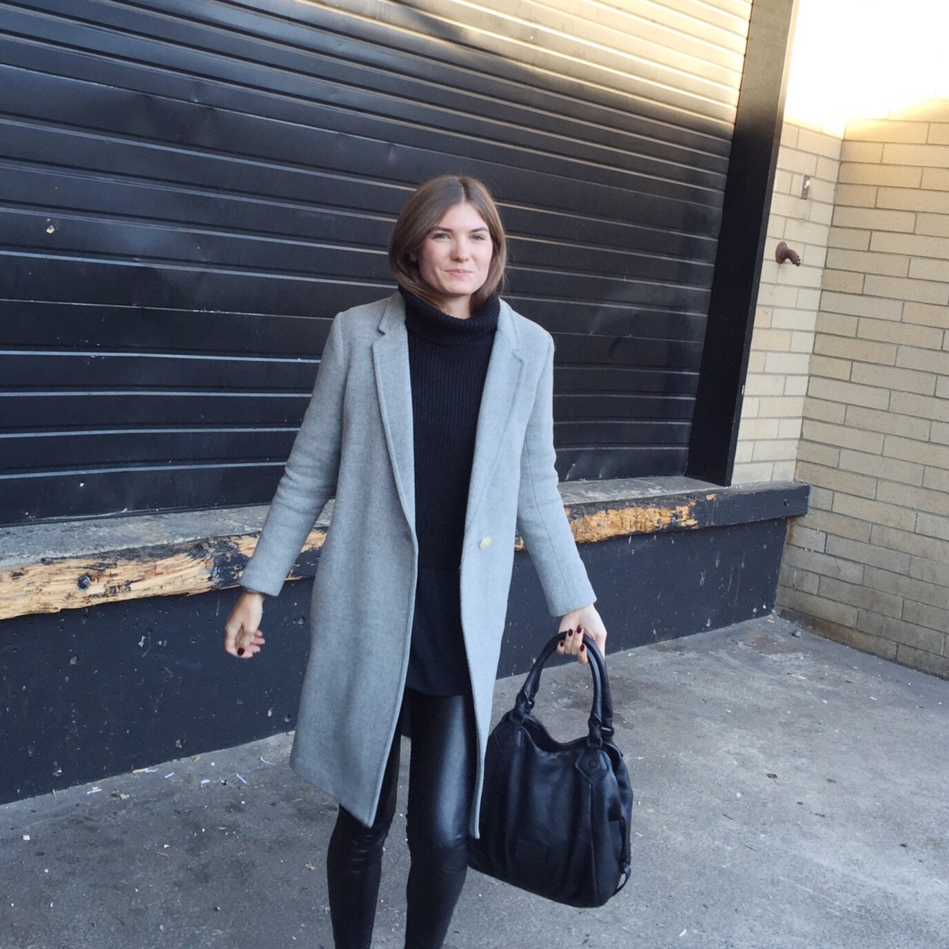 Jacket, Tunic, Sweater and Leggings, all by Aritizia. Shoes: Ecco, Bag: Marc by Marc Jacobs