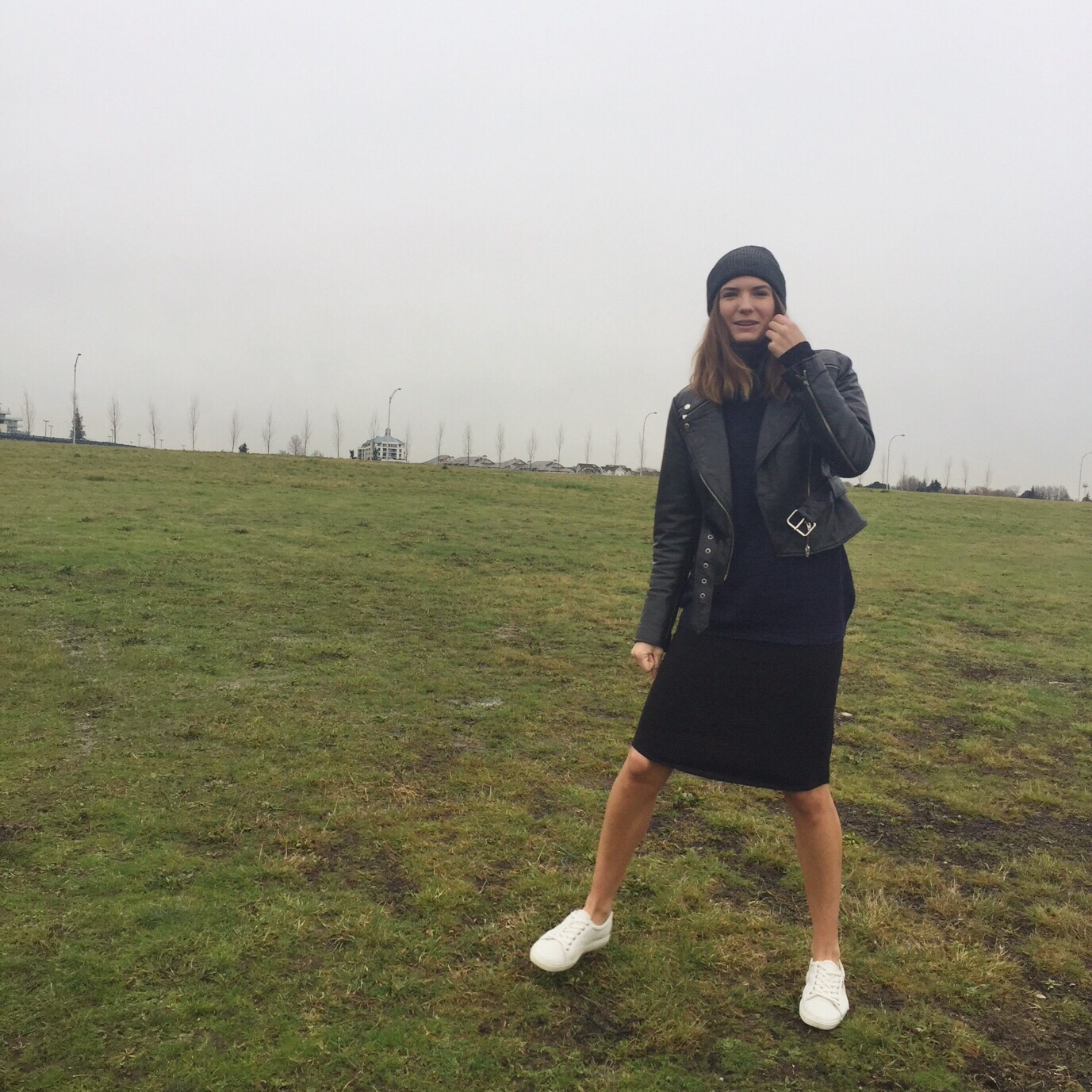Sweater: c/o Alex Harper Co (on sale for $36), Jacket: Similar here, Dress: Aritzia, Shoes: Ecco, Toque: Dollarama (seriously…but similar here)