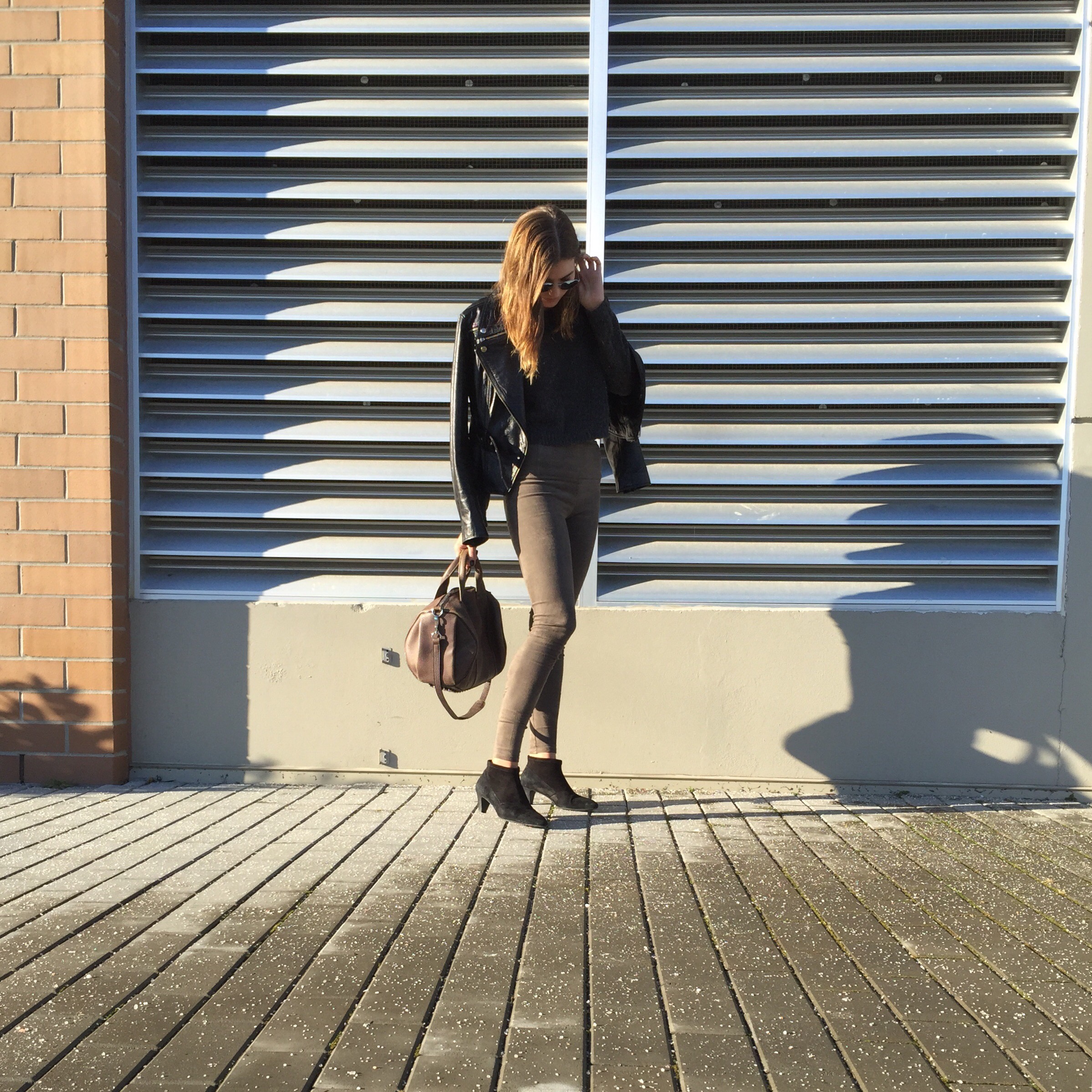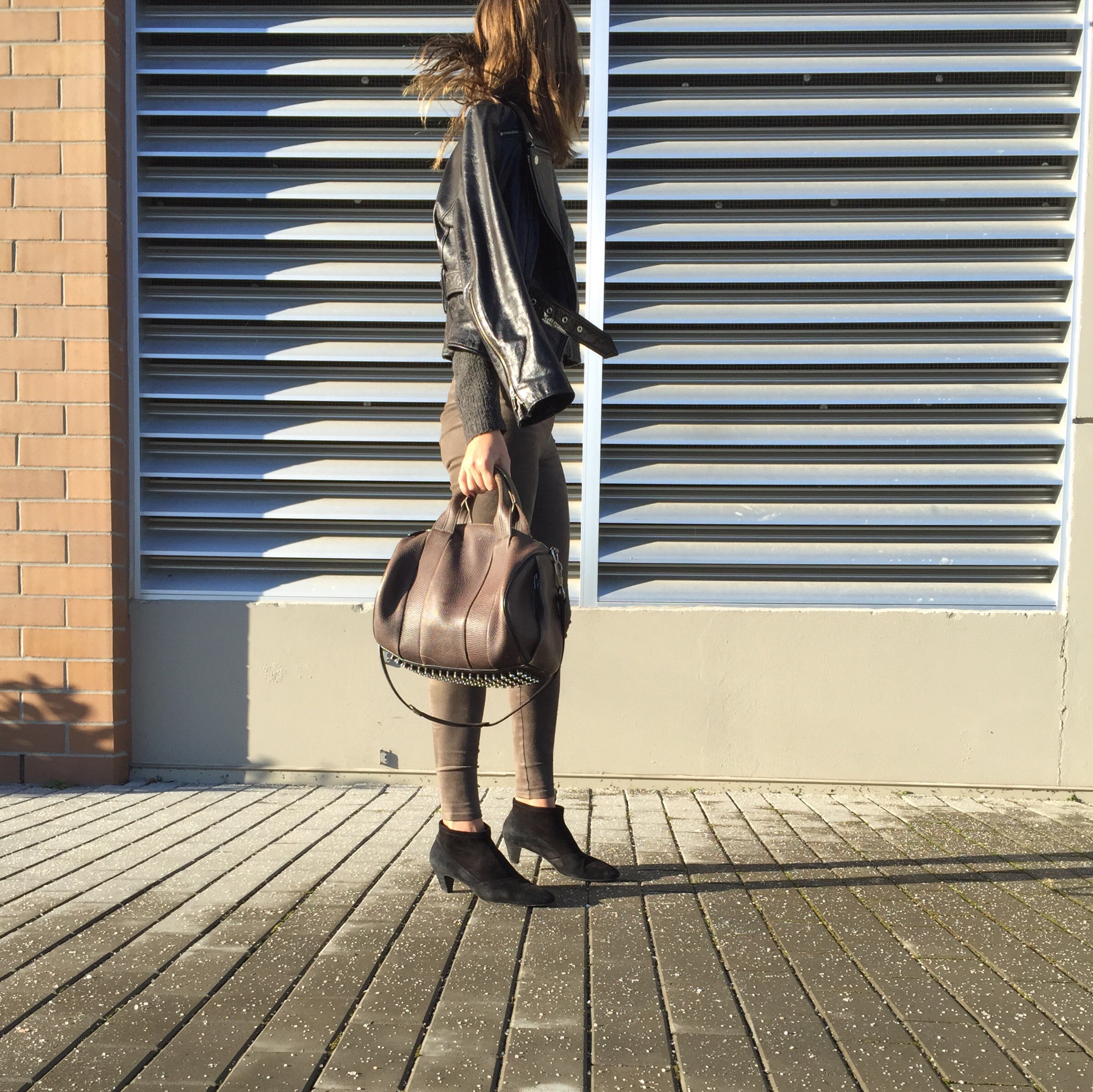 Leggings: Aritzia, Sweater: H&M, similar here, Booties: Ecco, Leather Jacket: Similar here, budget here Bag: Alexander Wang