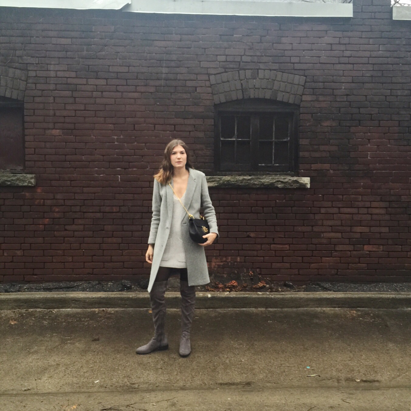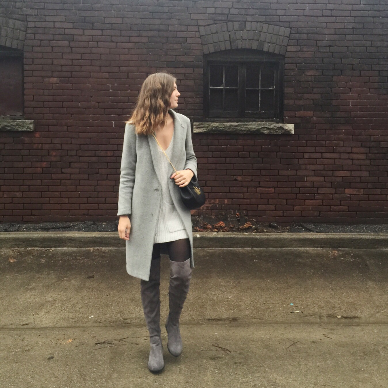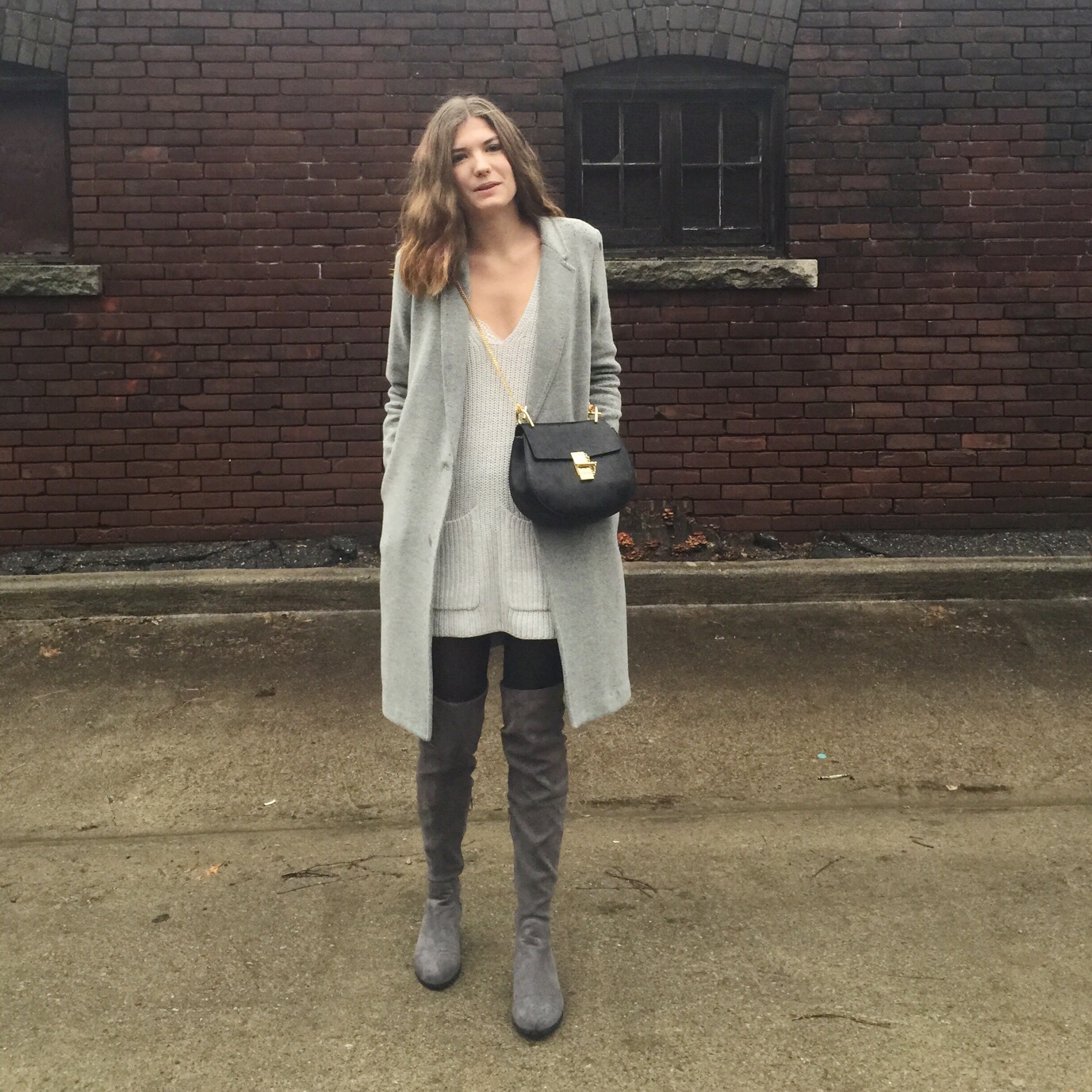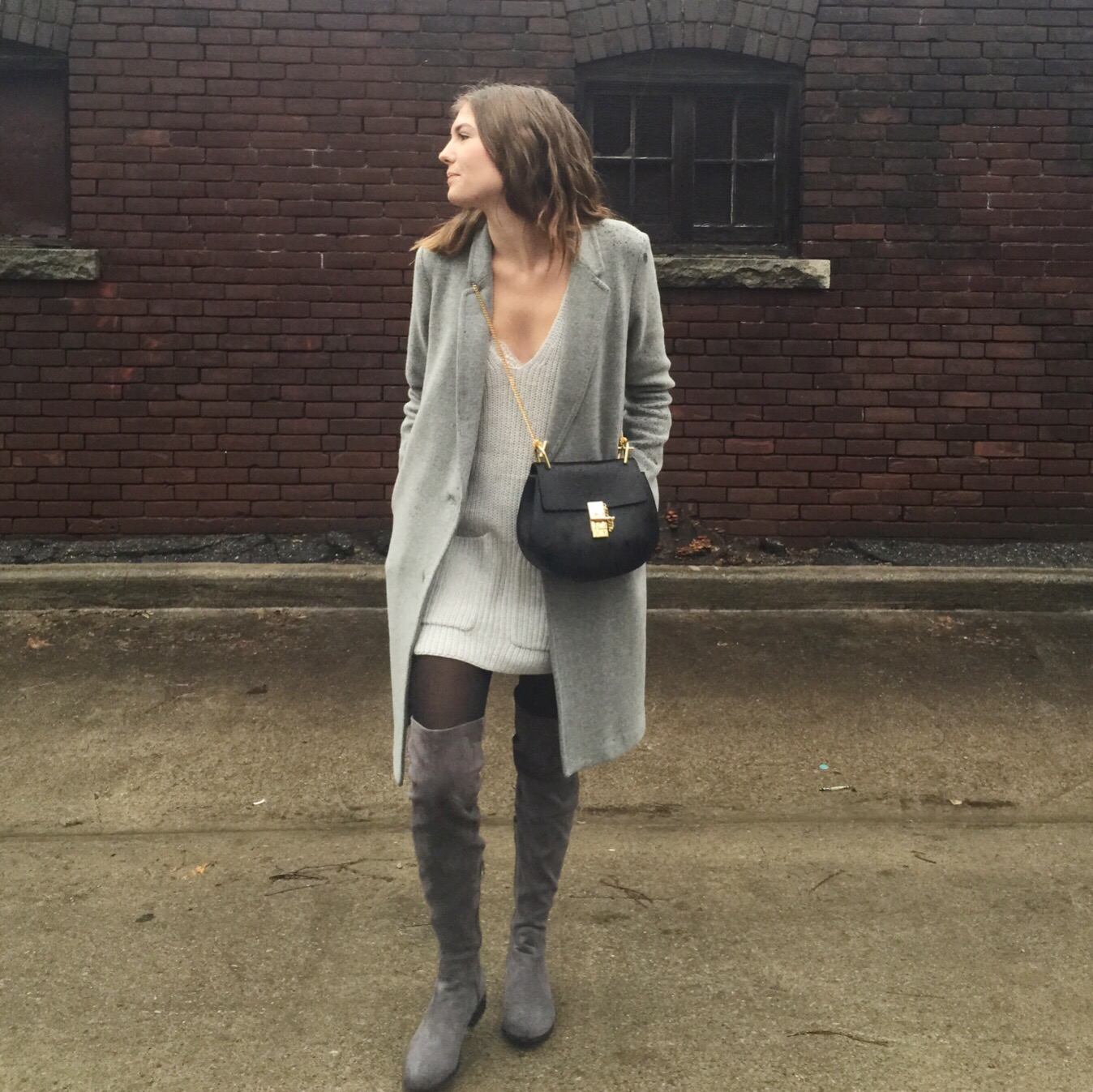 Boots: Forever 21 (sold out online), similar from Aldo, Coat: Aritzia, Sweater Dress: Aritzia, similar here (I sewed up the split sides), Bag: Chloe