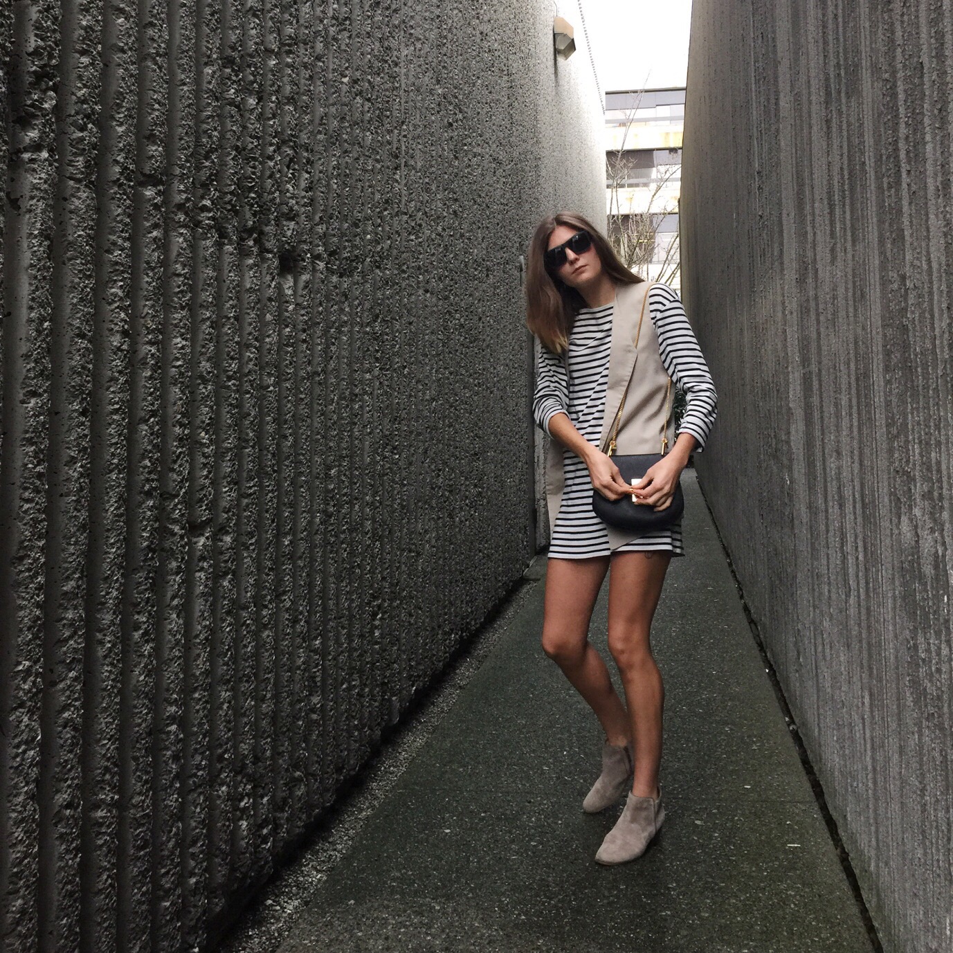 Sunglasses: Spy Optics, Booties: Clarks, similar here from Steve Madden, Dress: Zara, similar here and here, Sleeveless Blazer: Similar from Forever 21, Bag: Chloe