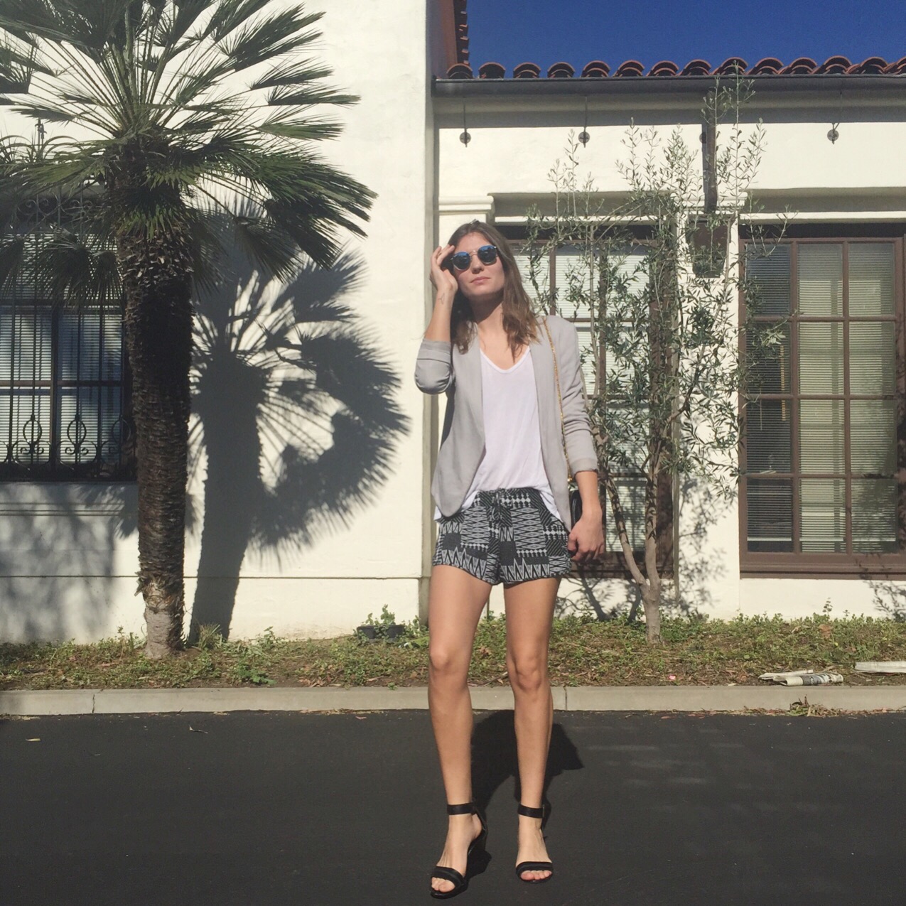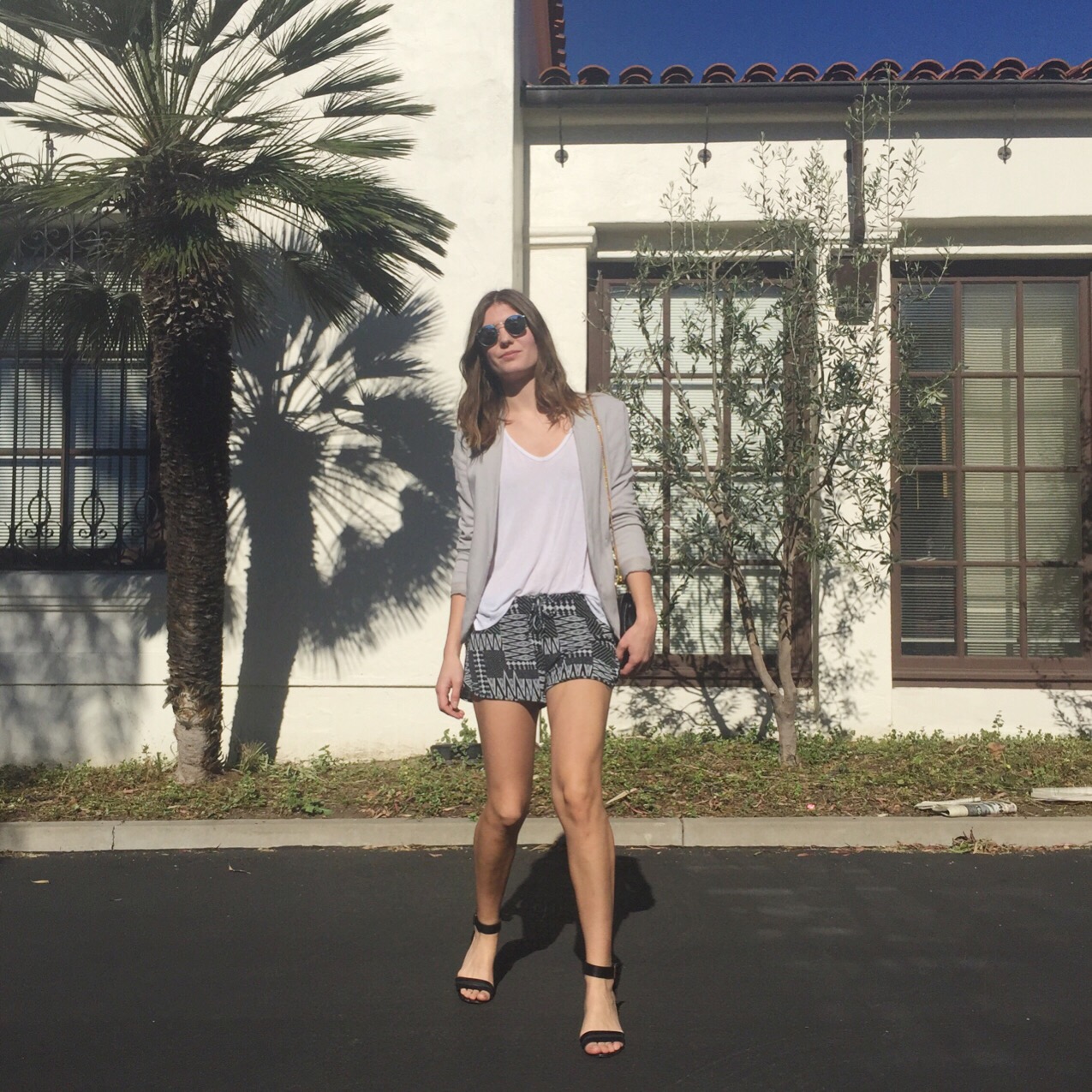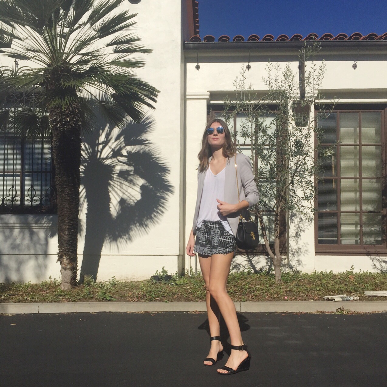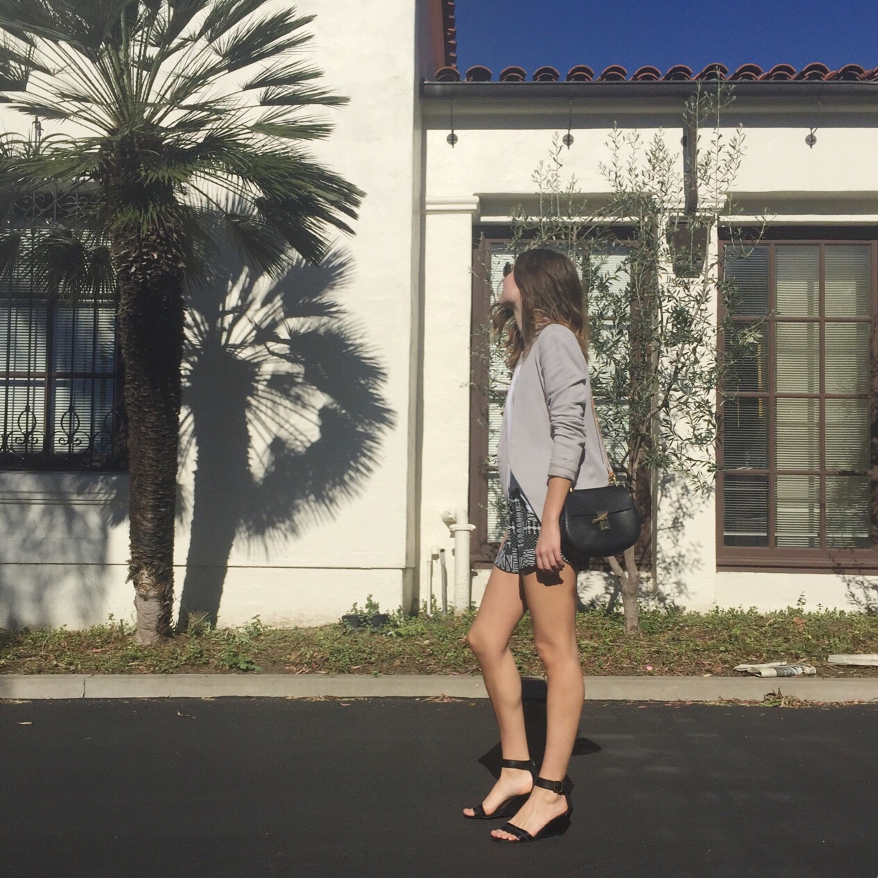 The shorts and t-shirt are both a super soft stretch jersey so they are about as close to wearing PJs as you can come. A structured blazer and heels bring fashion back to focus without compromising how comfy I am. Even though they are heels, I can walk for miles in these shoes. This was proved today when I couldn’t remember where I parked my car for almost an hour. But thanks to how beautiful it was outside, I even enjoyed the whole search. I seriously love California…