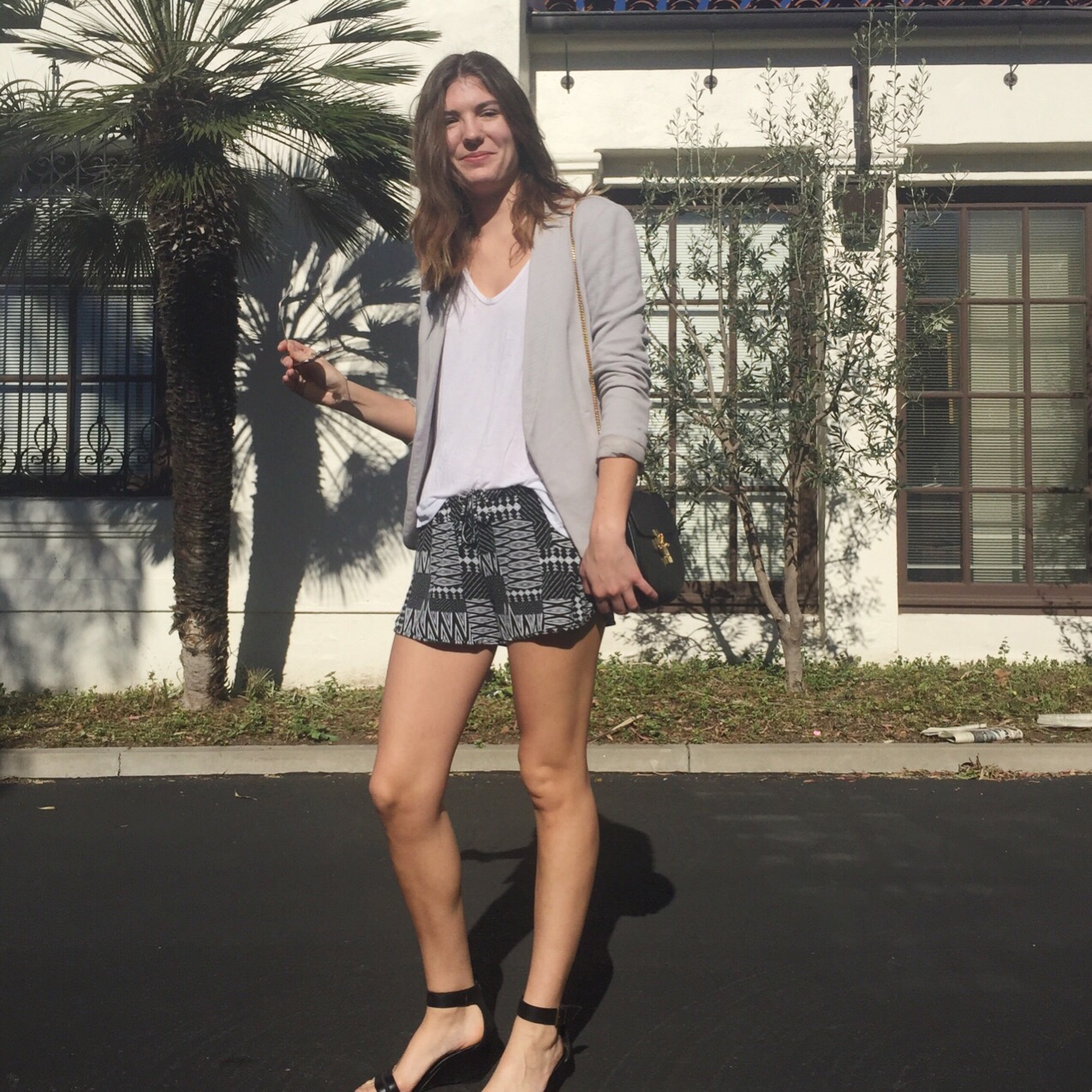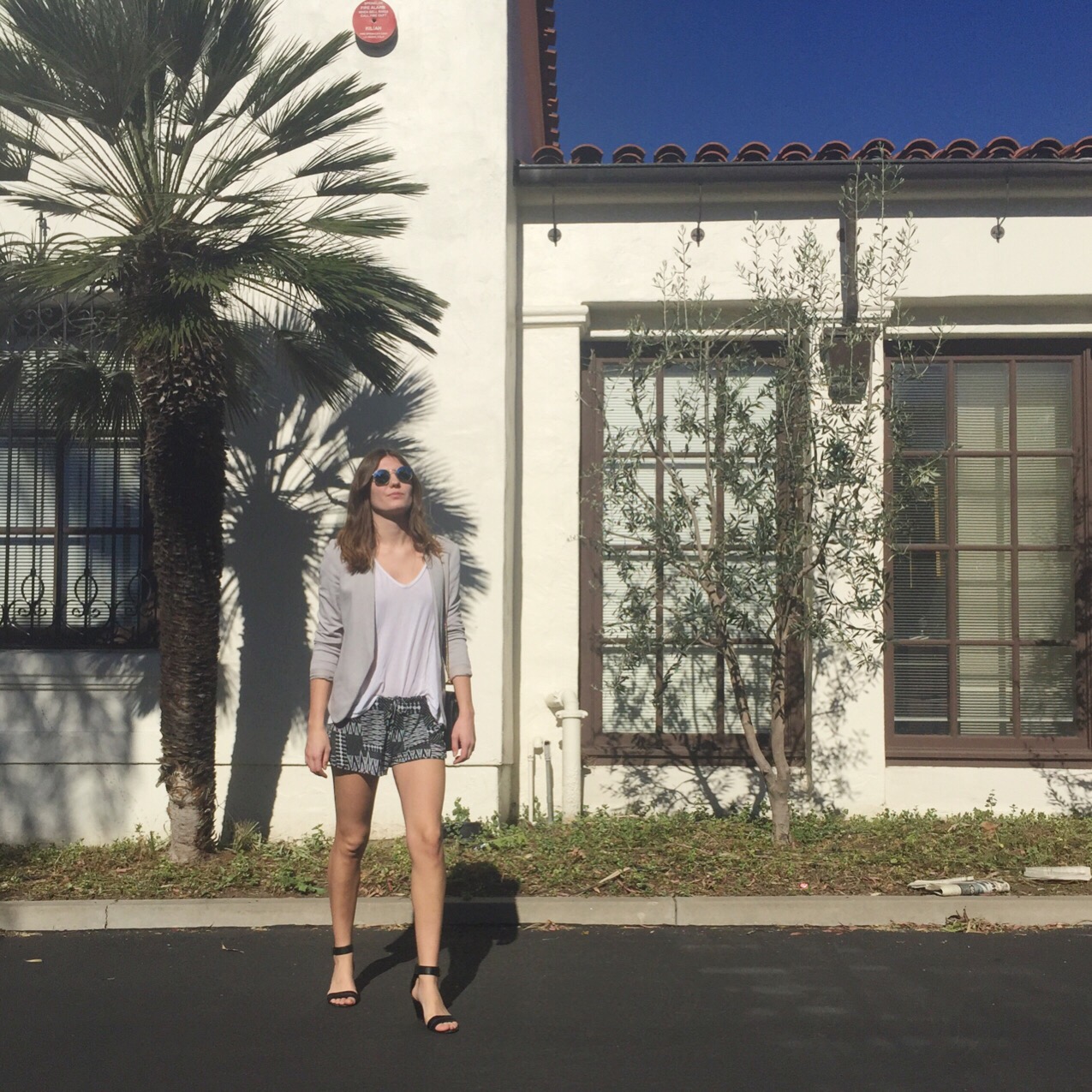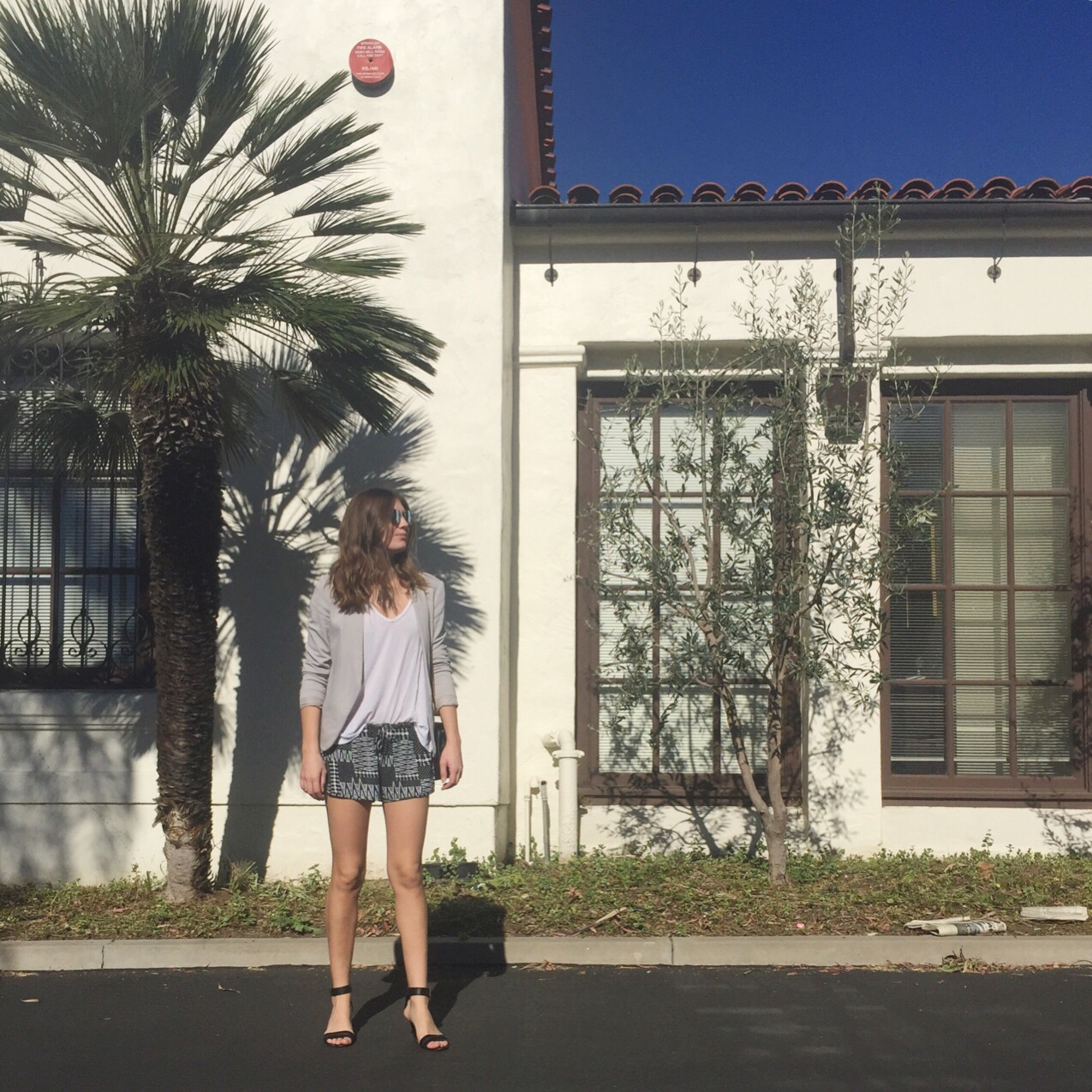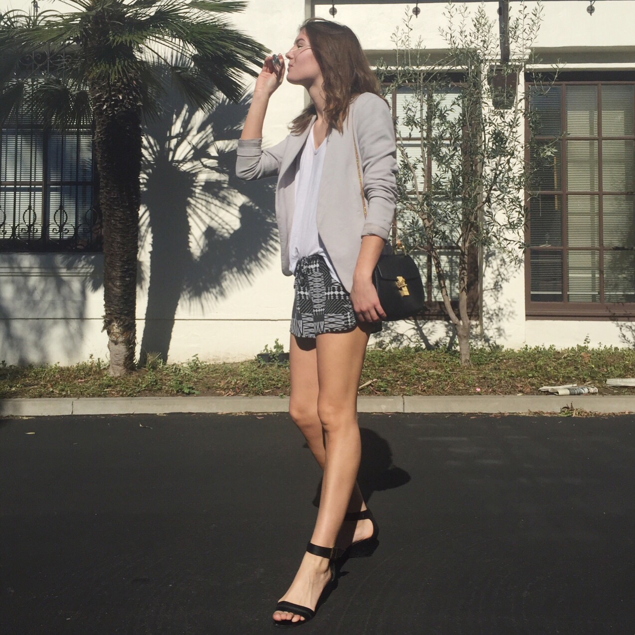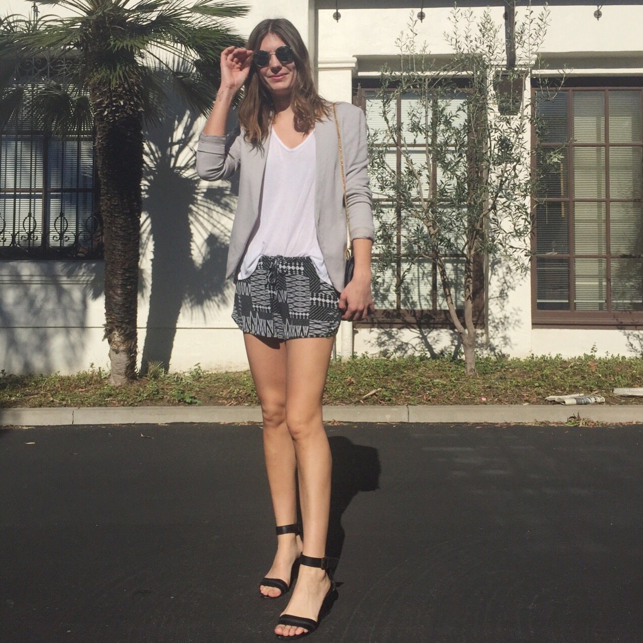 The shorts and t-shirt are both a super soft stretch jersey so they are about as close to wearing PJs as you can come. A structured blazer and heels bring fashion back to focus without compromising how comfy I am. Even though they are heels, I can walk for miles in these shoes. This was proved today when I couldn’t remember where I parked my car for almost an hour. But thanks to how beautiful it was outside, I even enjoyed the whole search. I seriously love California…