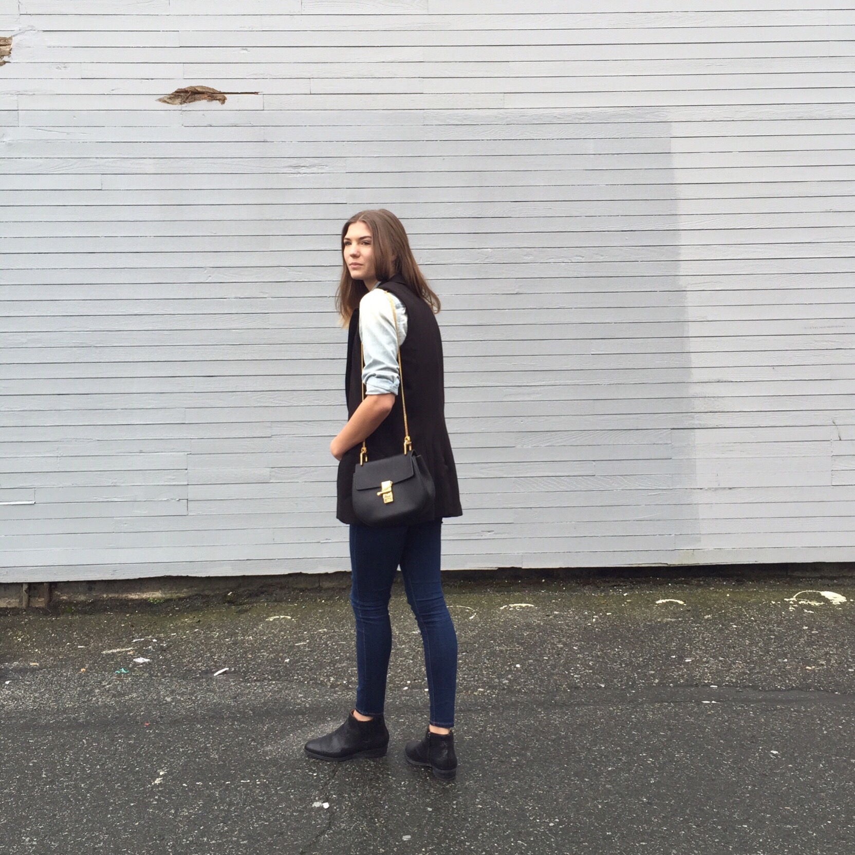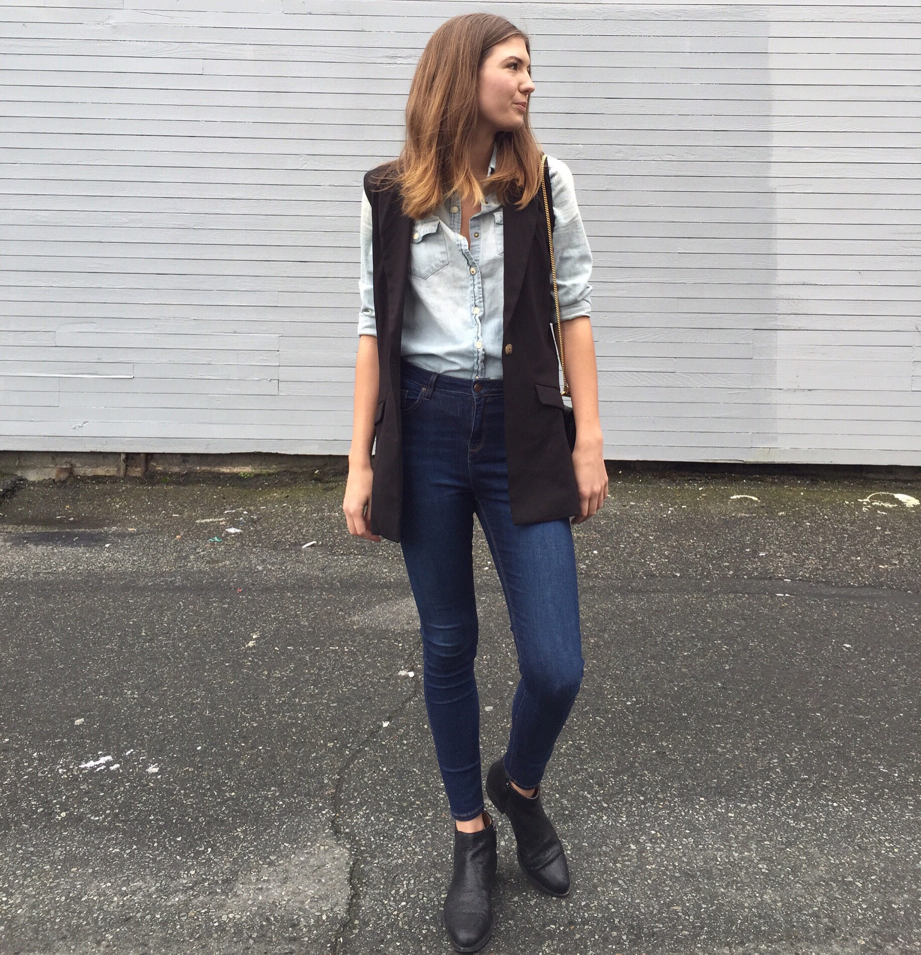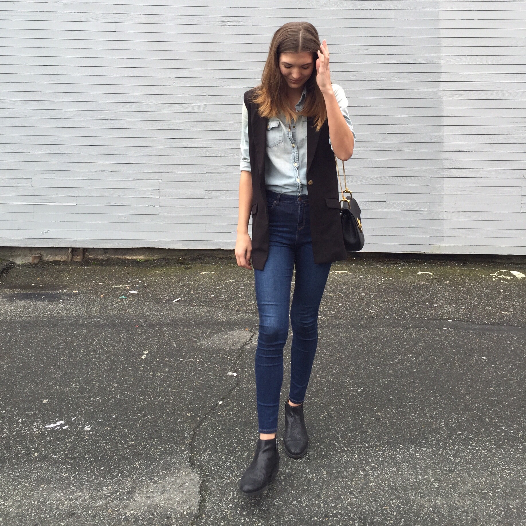 Denim Shirt: Forever 21, similar from H&M, Jeans: TopShop, Sleeveless Vest: Plum, similar from Zara, Booties: Ecco (similar), Bag: Chloe