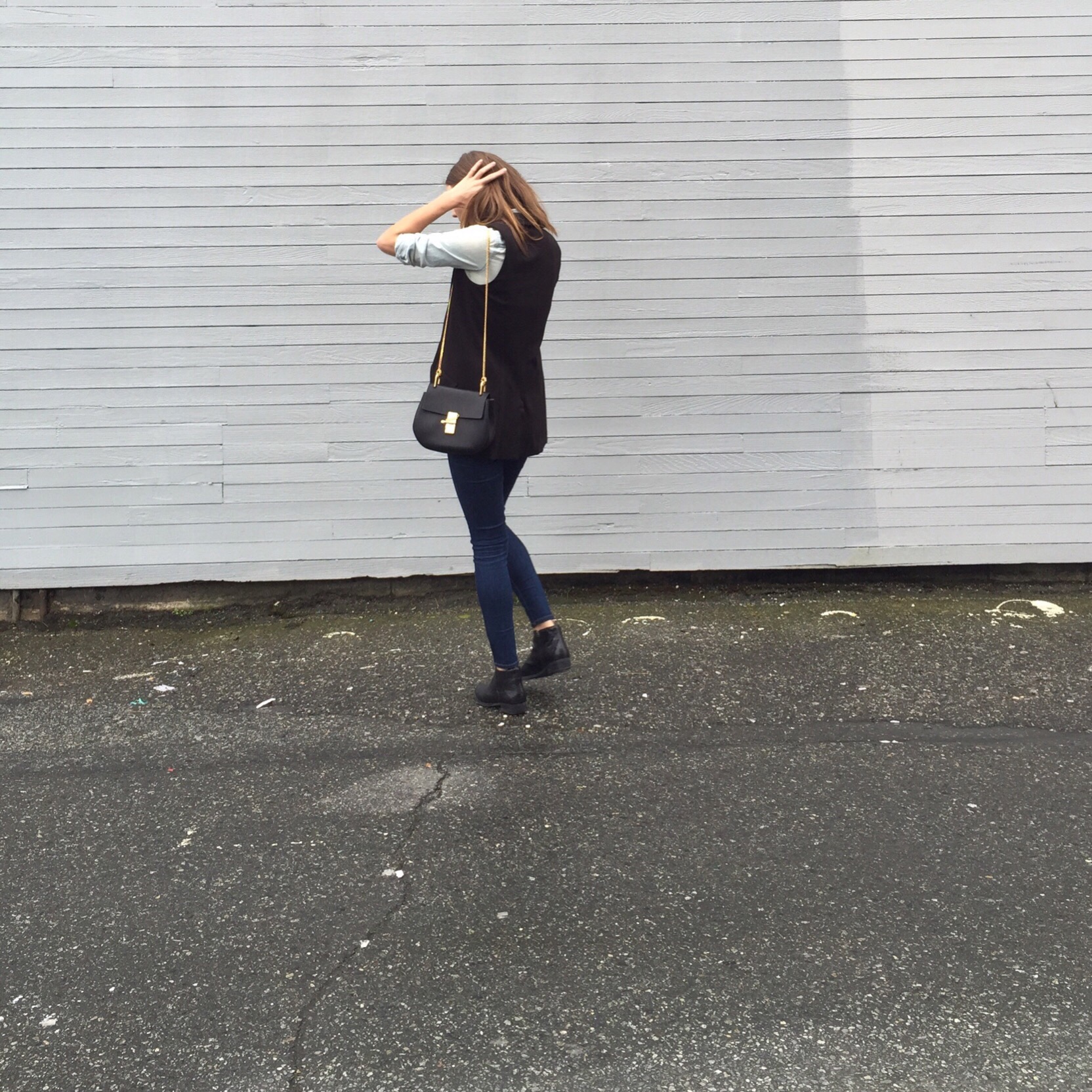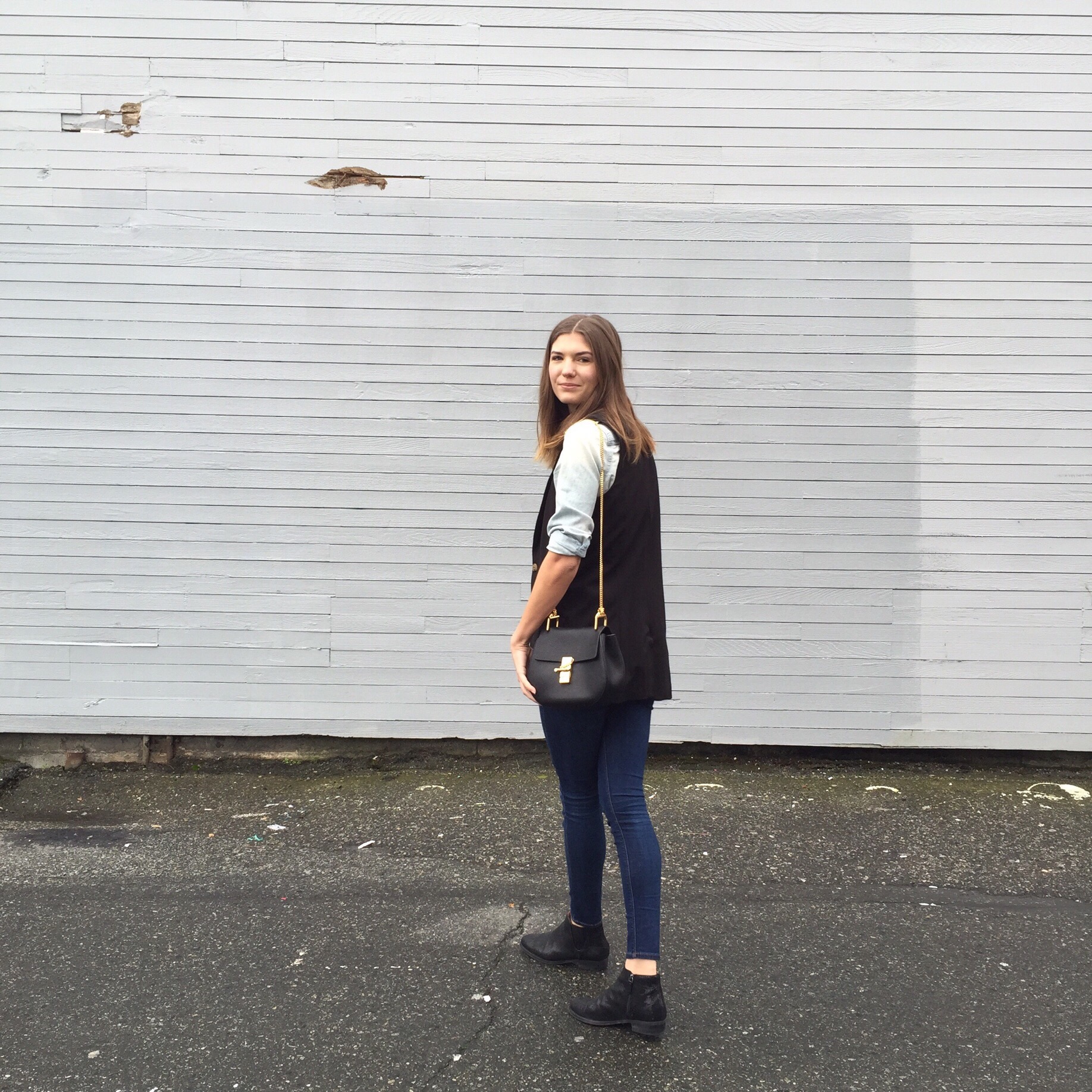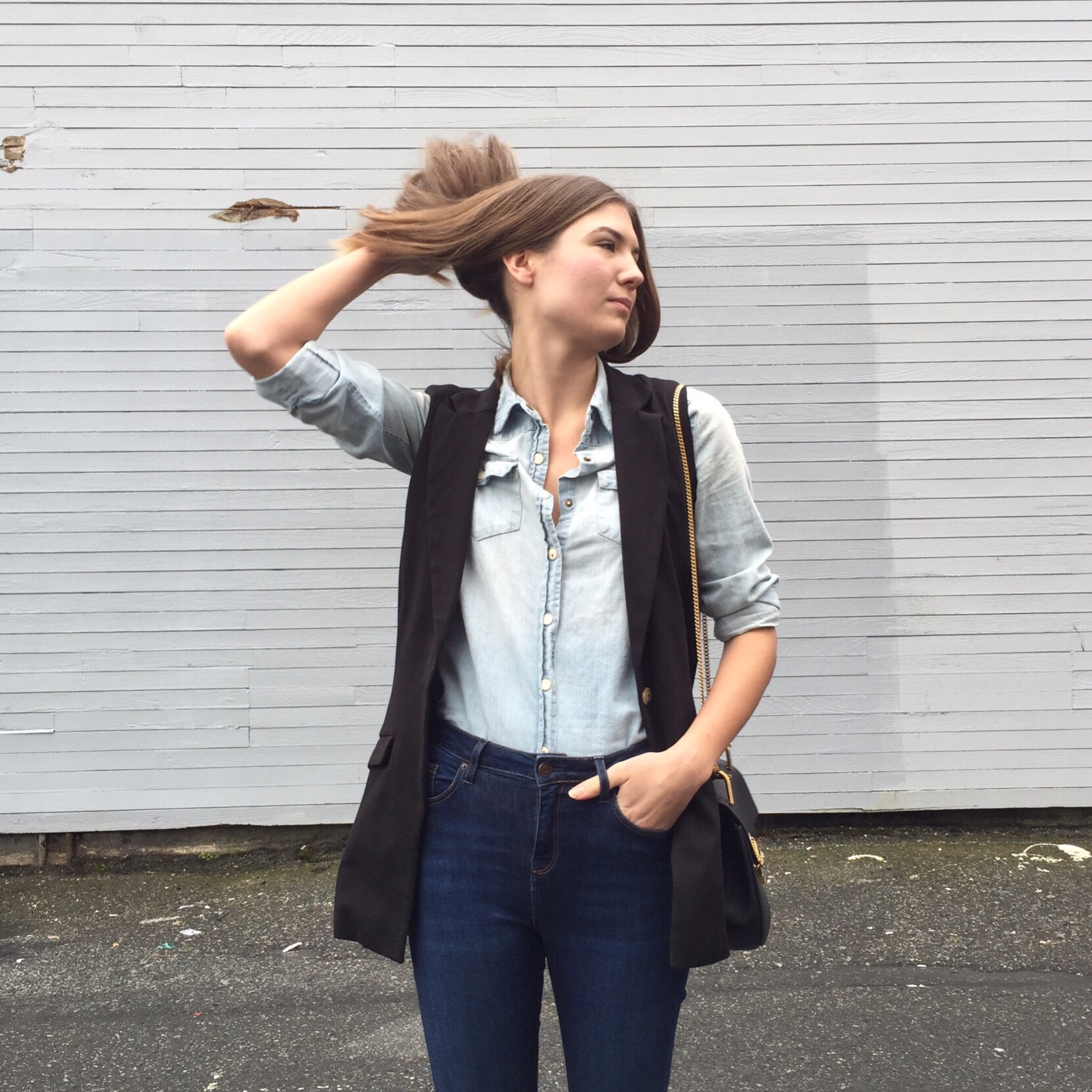 Denim Shirt: Forever 21, similar from H&M, Jeans: TopShop, Sleeveless Vest: Plum, similar from Zara, Booties: Ecco (similar), Bag: Chloe
