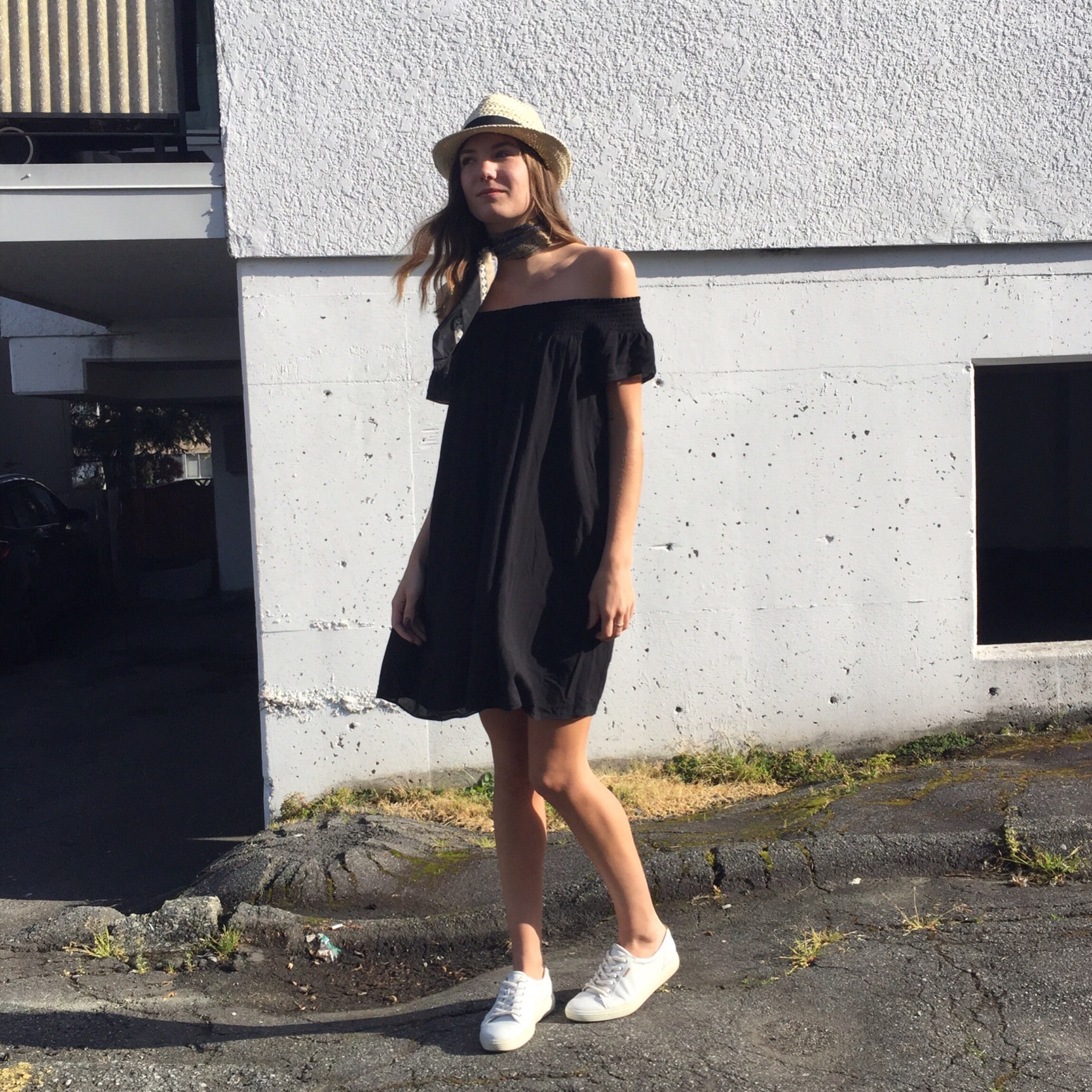 I’ve been seeing a lot of neck scarves around and found one of my own at Value Village this week. It’s the ideal item to get second hand and you can usually find a real silk one for under $5. I think it’s a fun way to play off the open neck of this dress, and it certainly solved my problem of how to jazz it up a little. Off the shoulder tops are hard to accessorize. Plus the flight-attendant vibe is travel ready, right?