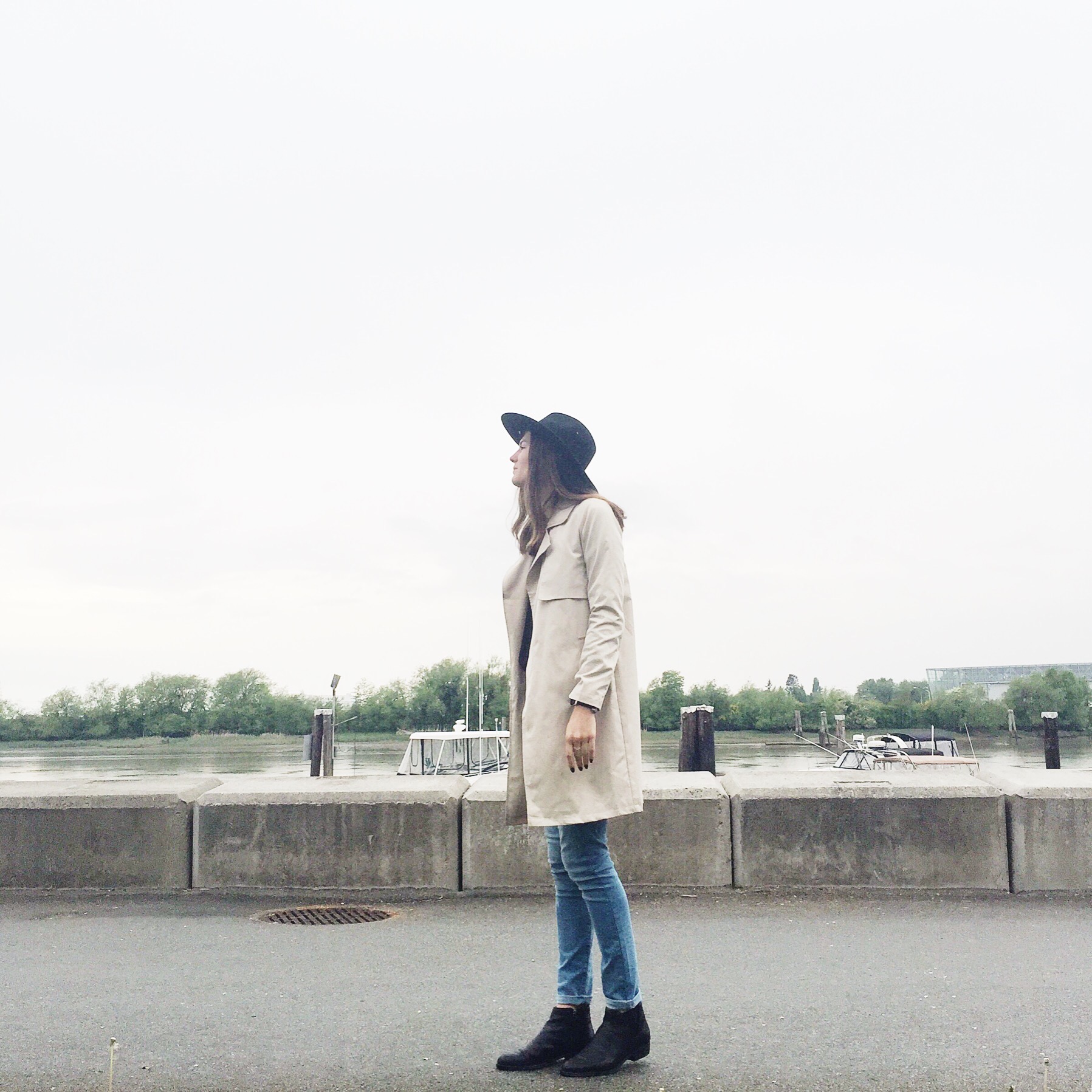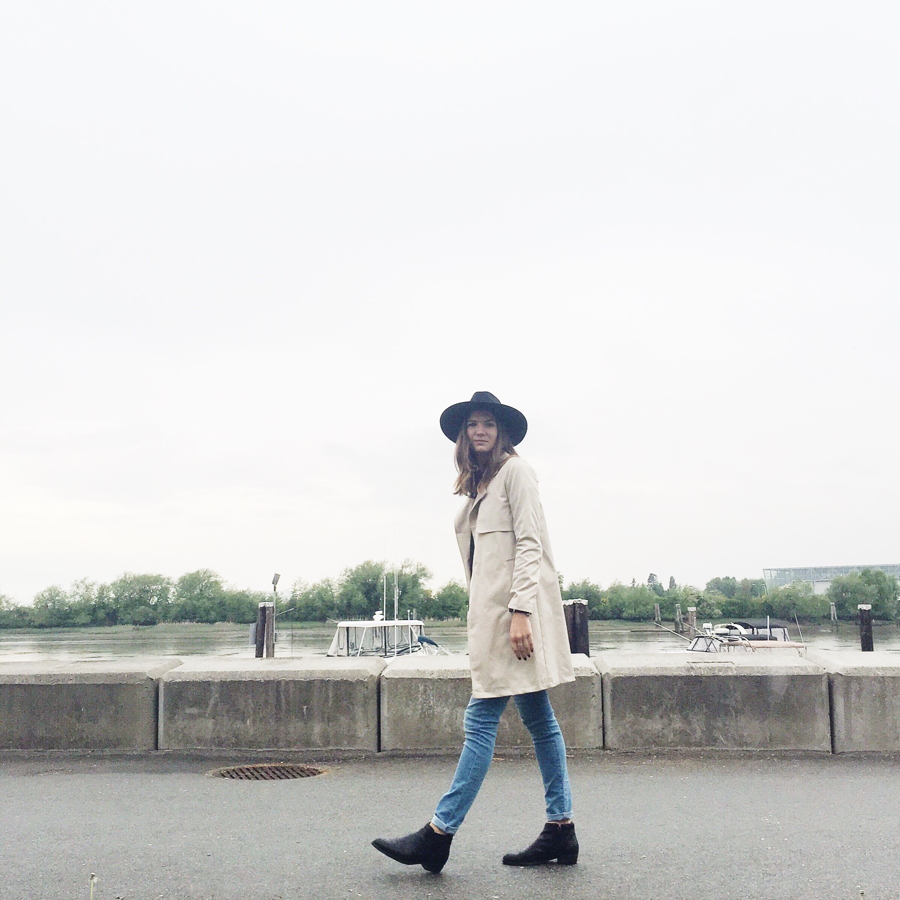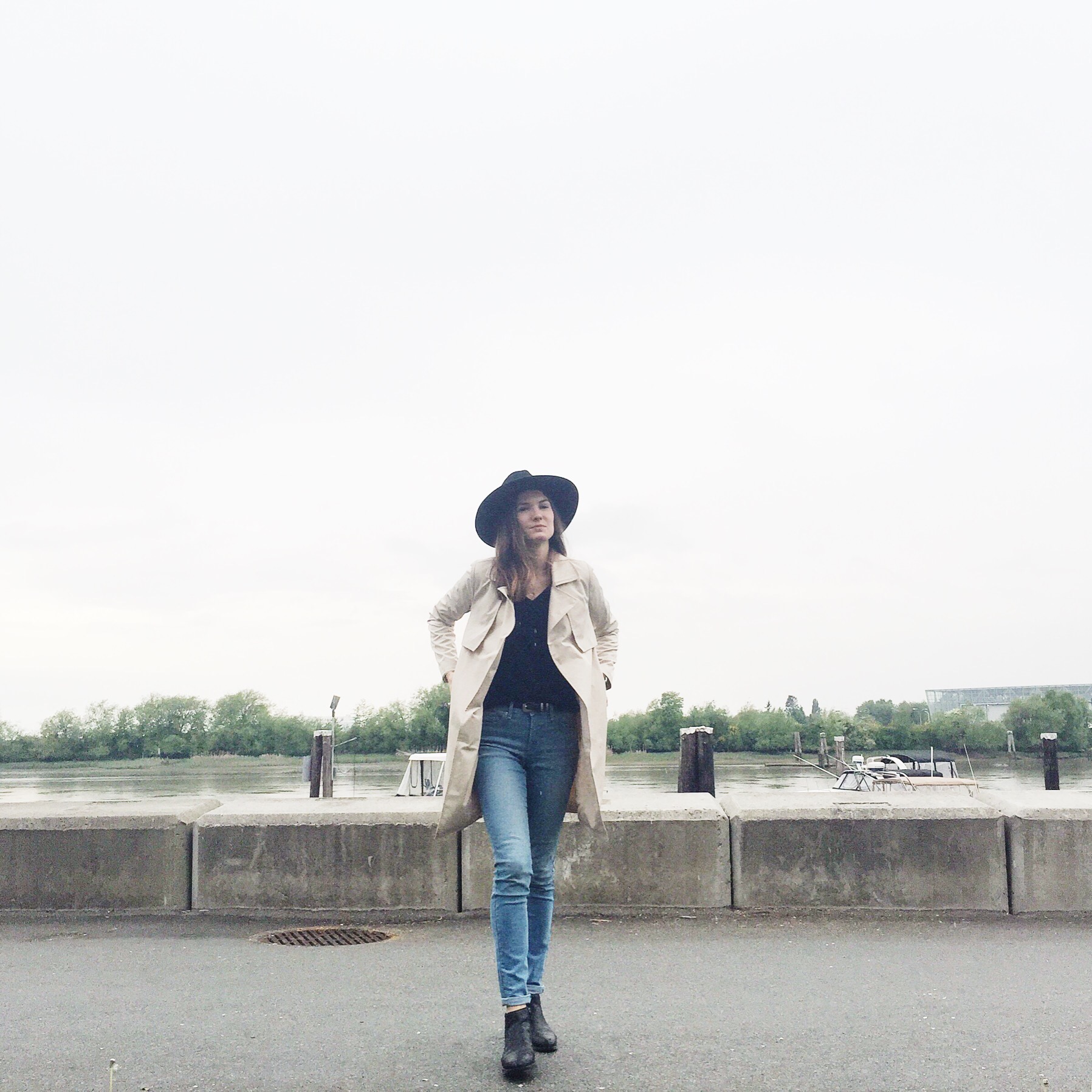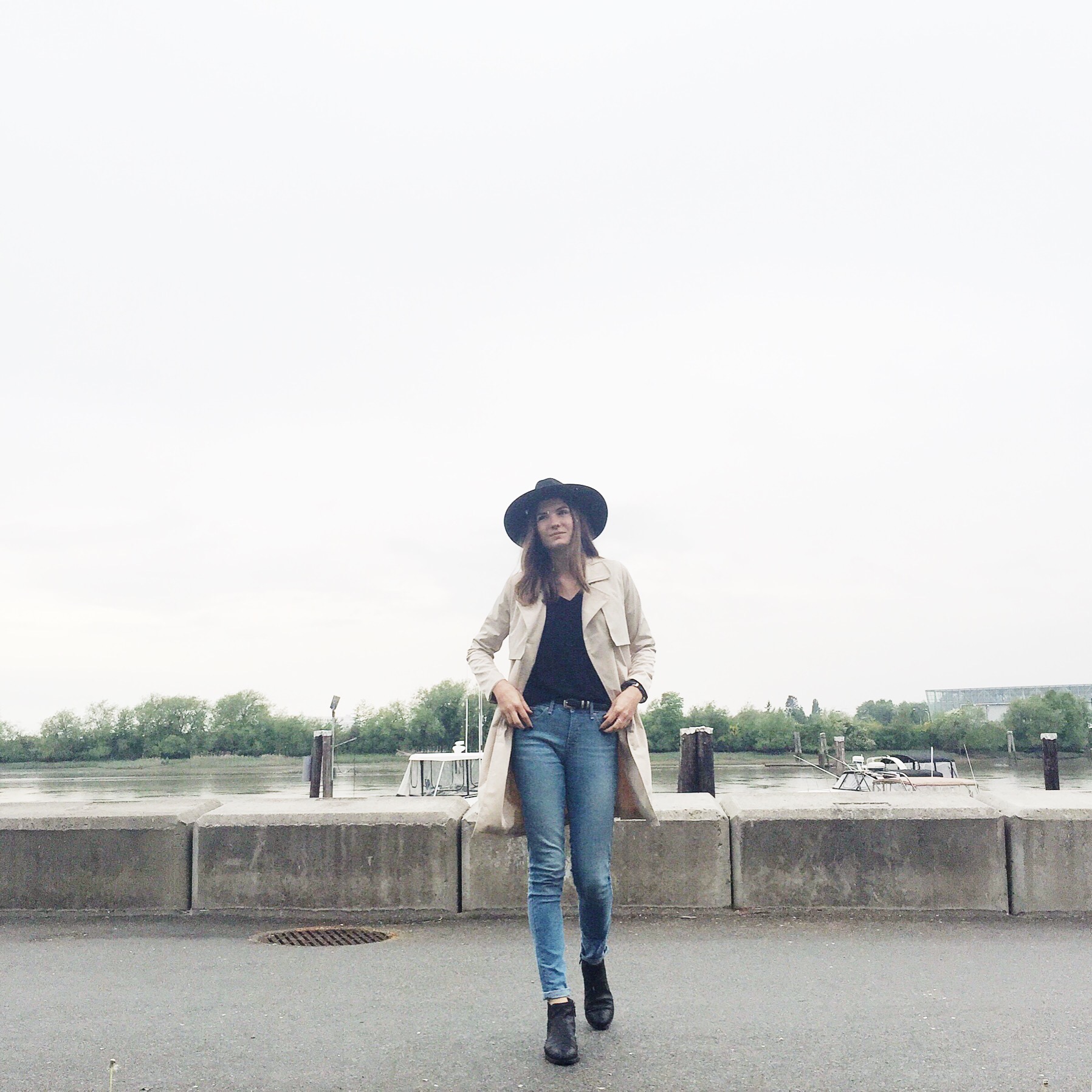 Trench: Forever 21 (similar water repellent from Zara), Hat: Joe Fresh (similar from Forever 21), Jeans: Levis, Shirt: Aritzia, Boots: Ecco (similar), Belt: Zara (similar from Forever 21)