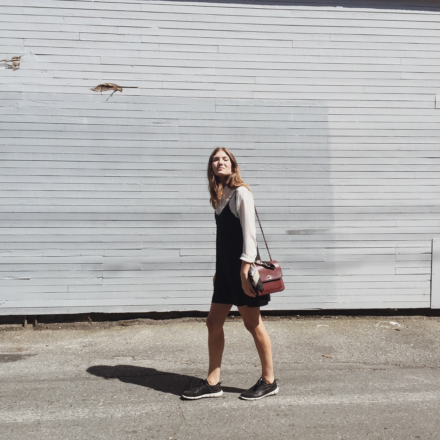 The key to making it more casual is layering over a shirt for more coverage. Button ups or plain white tees work great for this, and also help in spring if the weather hasn’t totally warmed up yet. I was a bit worried the top would just bunch up under the slinky silk, so go for something fitted or just tuck it into bike shorts like I did. Sneakers continue the laid back vibe and keep the look as far away from lingerie sexpot as possible. I’ll leave that for the evening hours!