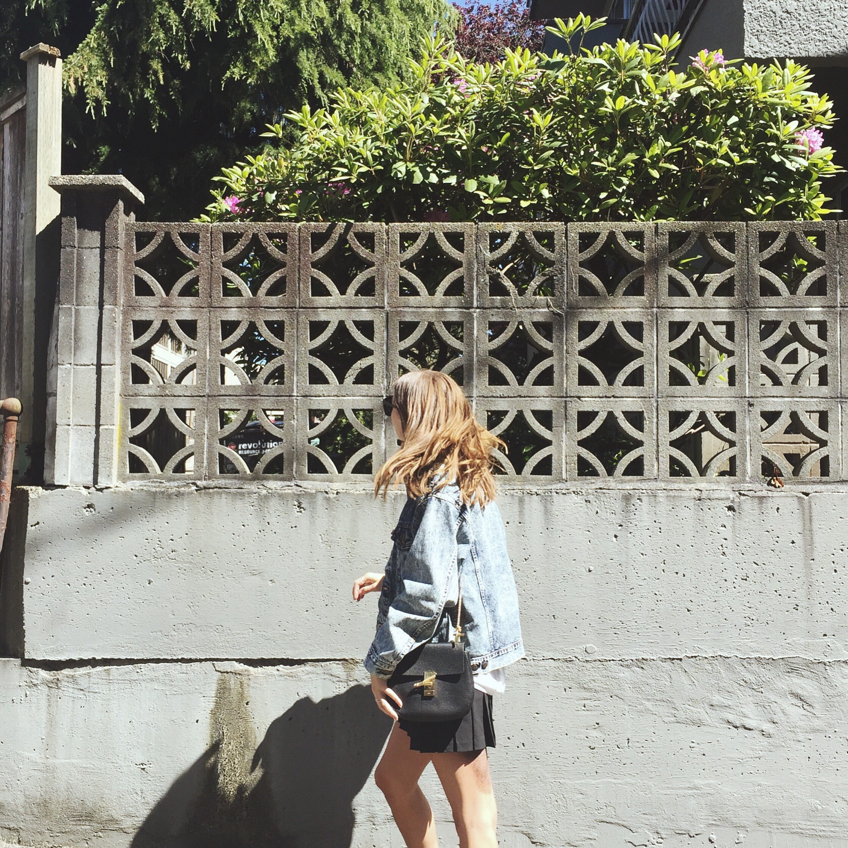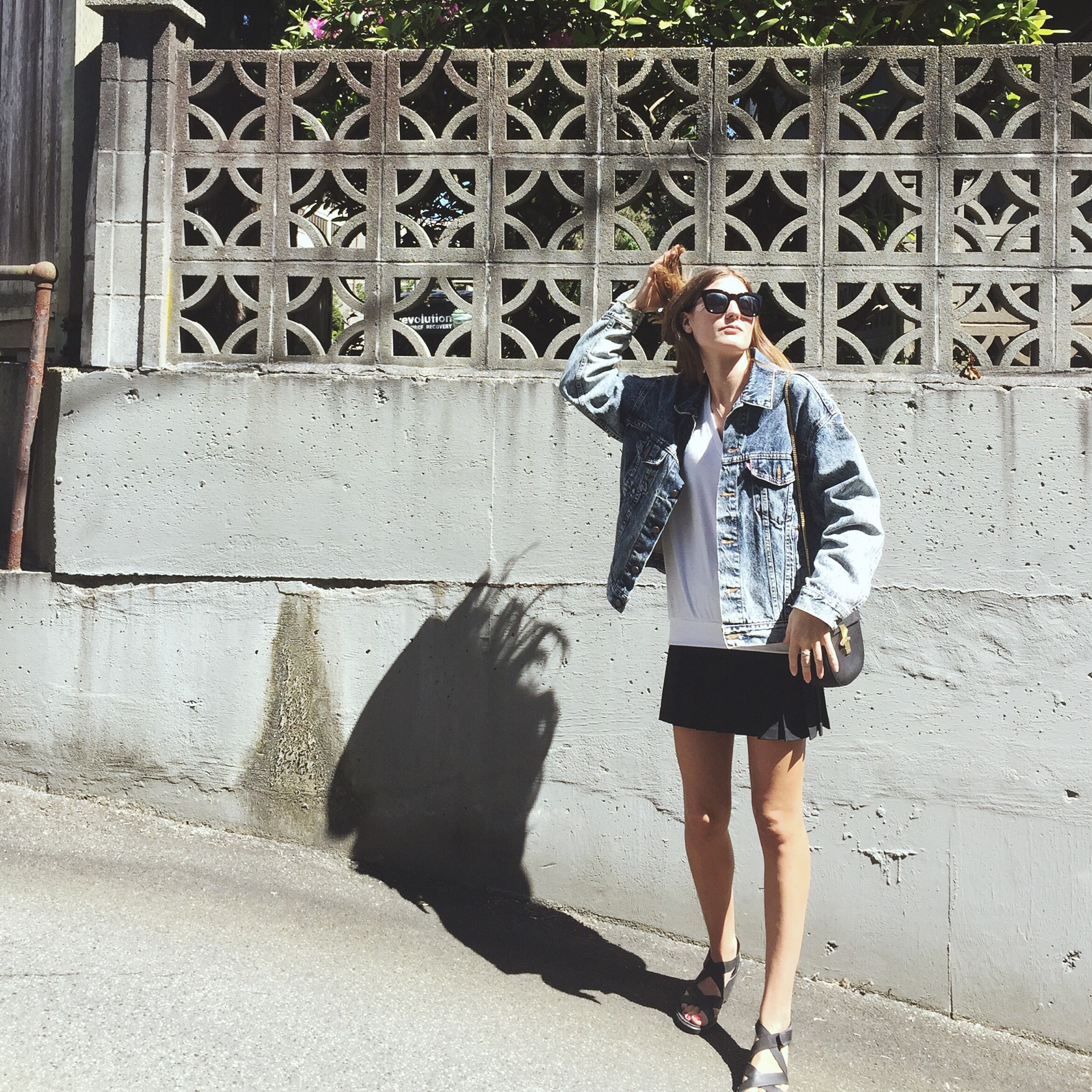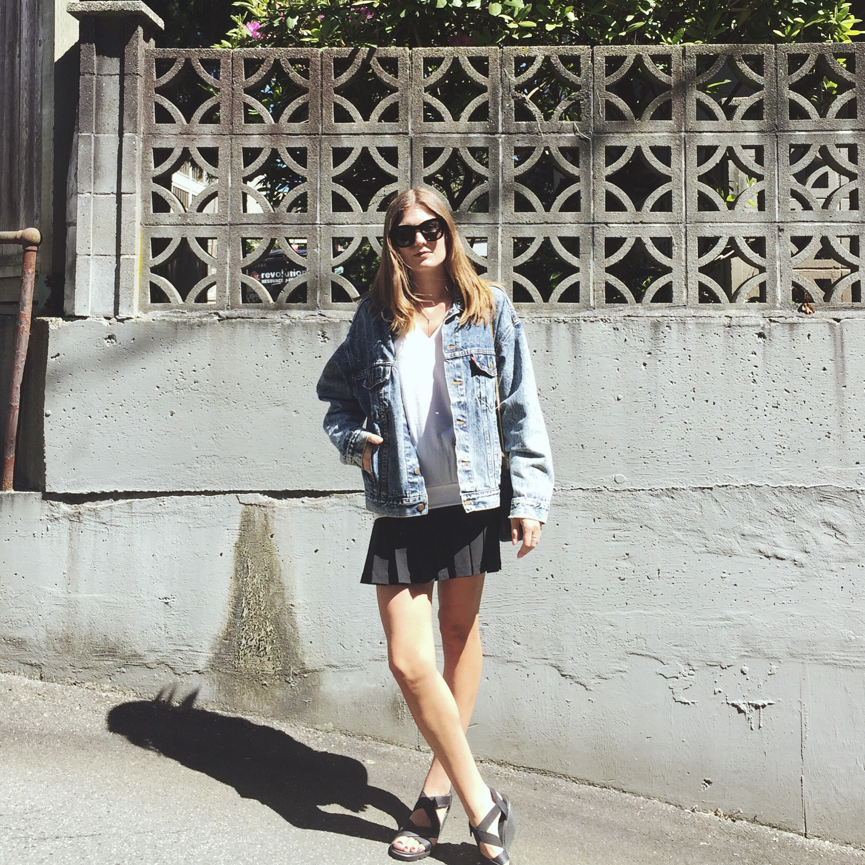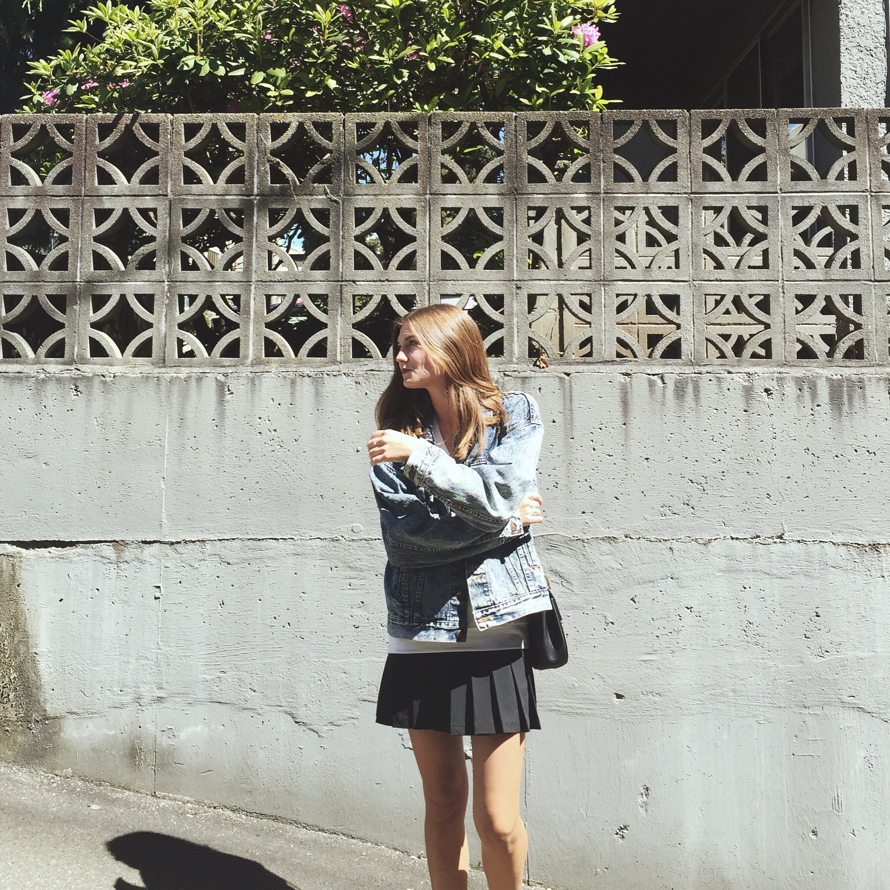 Denim Jacket: from Mintage, similar here on sale from Forever 21, Shirt: Aritzia (similar), Skirt similar here, Shoes: Ecco
